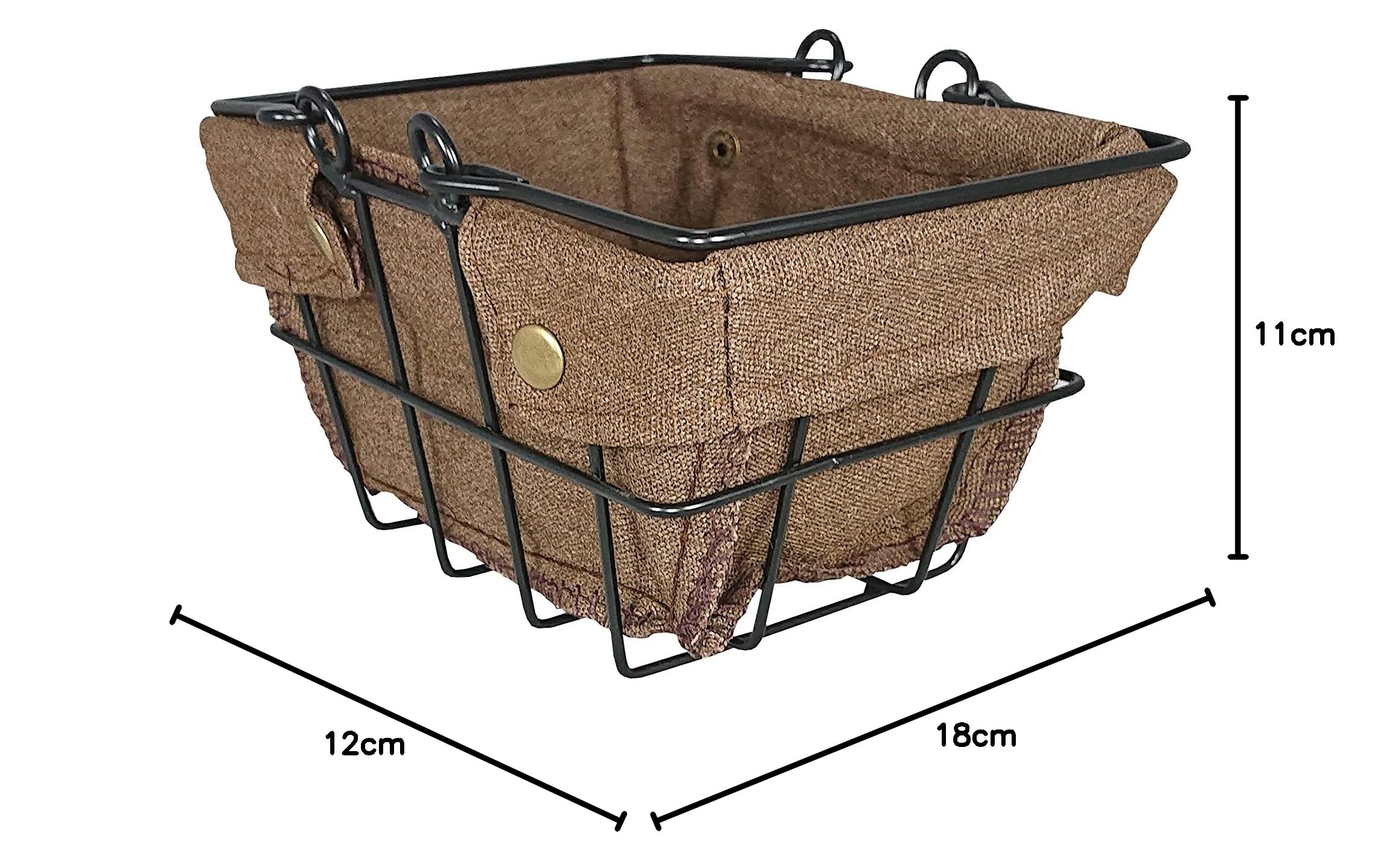 小さめのカゴ。持ち手を含まないサイズ 幅:約18cm(上部)、約12cm(下部) 奥行:約12cm(上部)、約9cm(下部) 高さ:約11cm(持ち手をひっかける部分含む)。