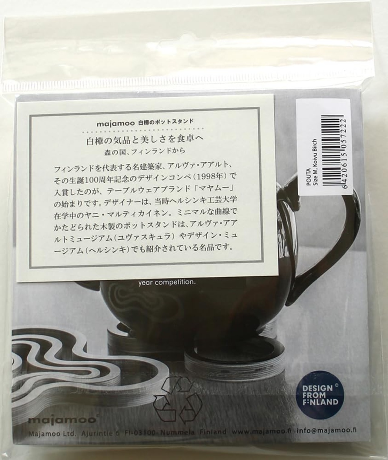 アアルト生誕100周年のデザインコンペに入賞。アルヴァ・アアルトが好んで描いていた「波」へのオマージュを表現。 ギフトとしての人気も高い、優れた実用性とデザイン性です。鍋のままテーブルに置いてもスタイリッシュ。白樺材の合板でできており、耐熱は100℃です。インテリアとしても溶け込むフォルムでどんな素材のポットや鍋でも合い、インテリアにスッと溶け込みます。