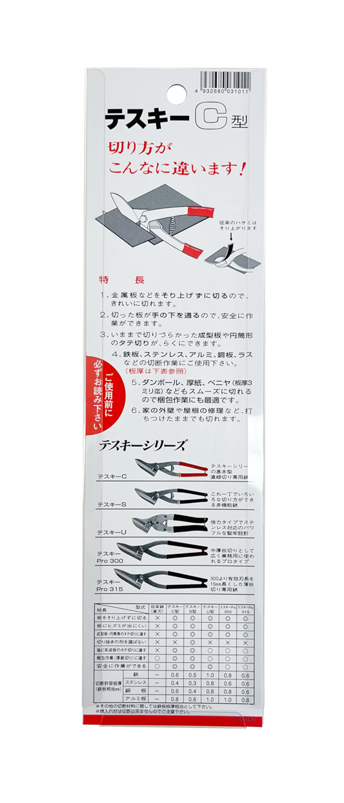 切断許容板厚:鉄0.6・ステン0.4・銅板0.6・アルミ板0.8mm