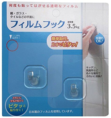 鏡・ガラス・タイルなどの平面に何度も貼ってはがせるフィルム一体型フック。