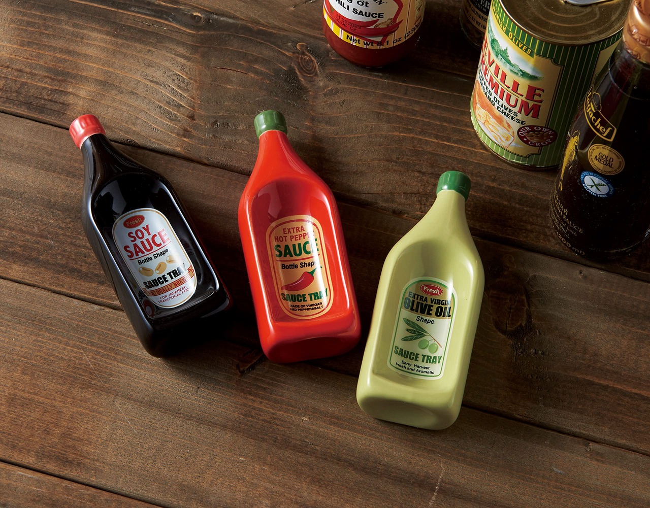 調味ボトルモチーフのソース皿。ソースはもちろんおつまみや小皿料理を乗せたり、食卓を楽しく彩ります。パーティーなどに使うのもおすすめです。