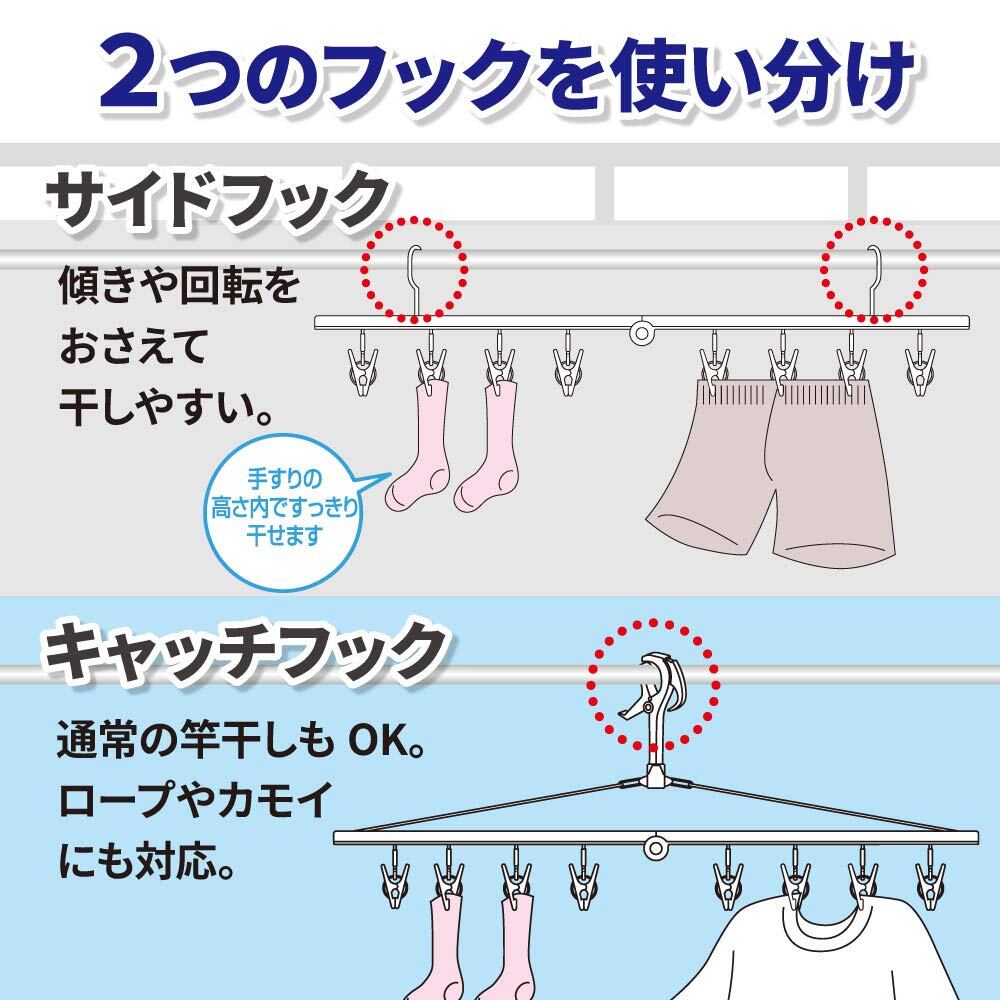 ●サイドフックを使用すれば、傾かずにバランスよく干せ、風などで回転するのを防いで安心して干せます。