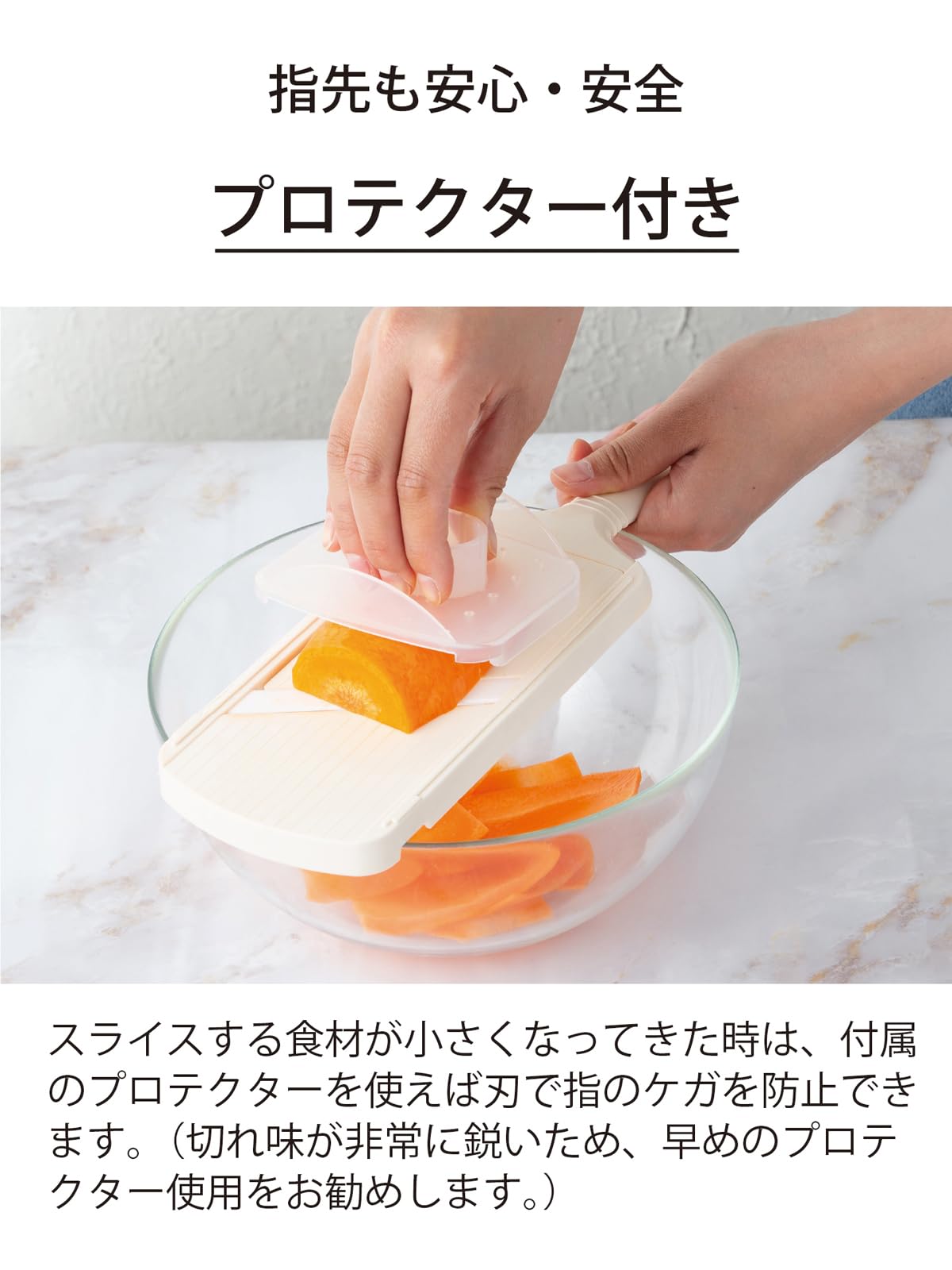 ●食材が小さくなった時に刃から指を守るプロテクター付きです
