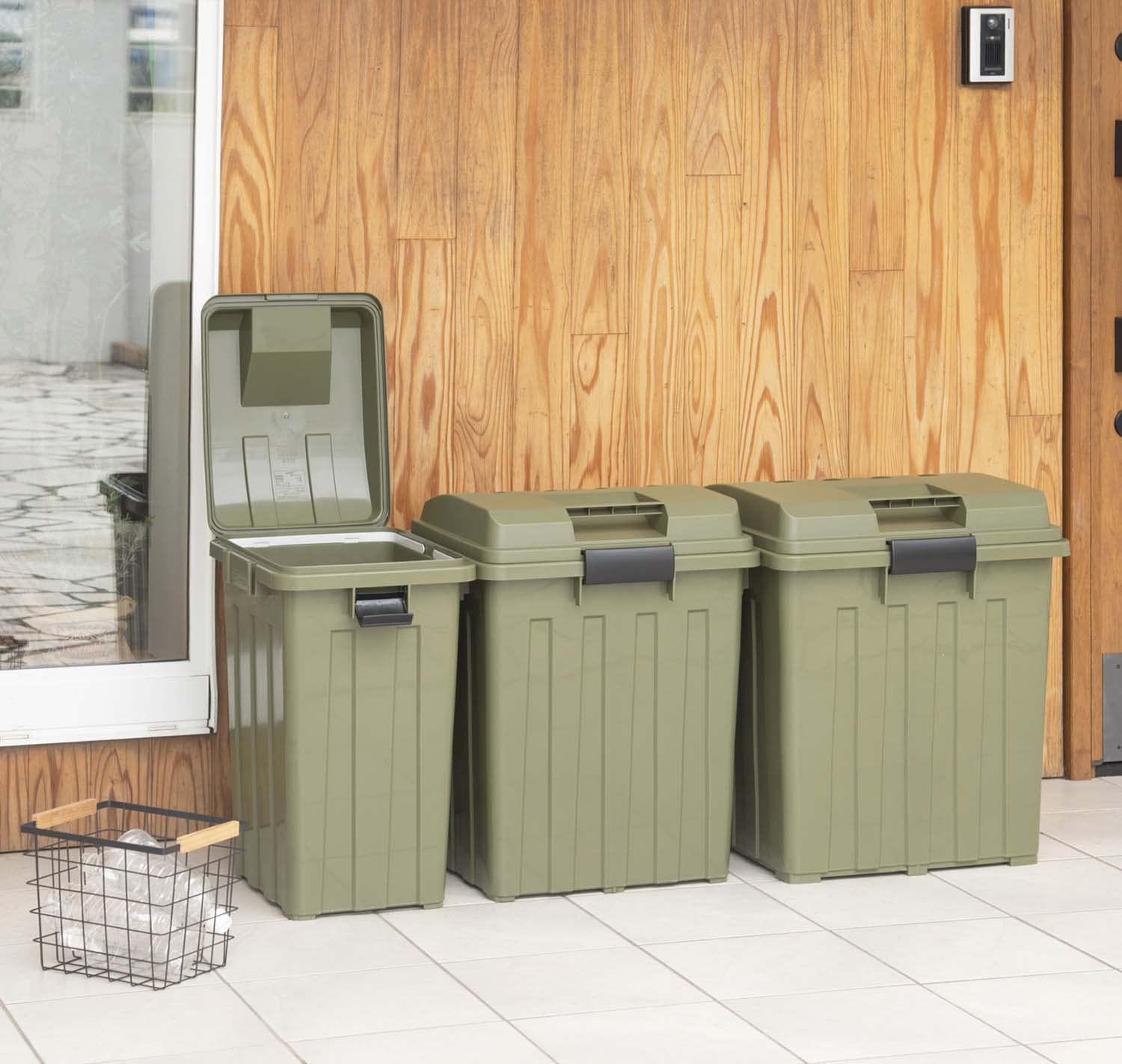 新輝合成 トンボ ゴミ箱 連結可能 ハンドル付 90リットル カーキグリーン 幅54×奥行46.5×高さ62cm 蓋付き 分別 丈夫 屋外 ベランダ 大きい アウトドア 日本製