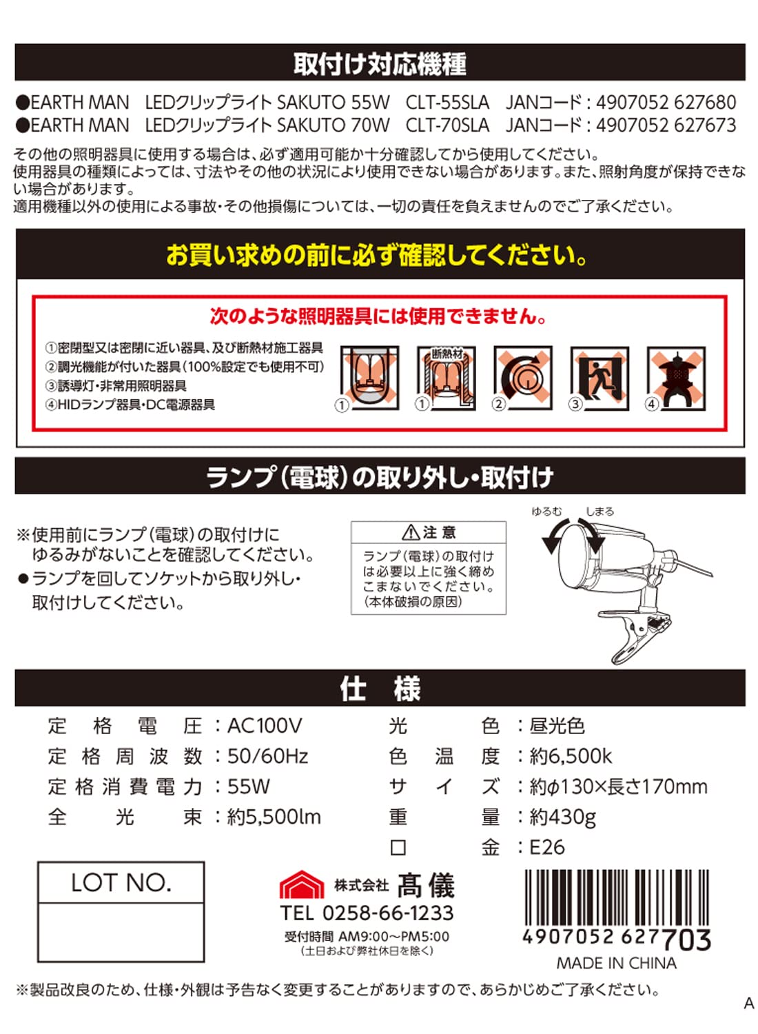 EARTH MAN LEDクリップライト SAKUTO 55W CLT-55SLA JANコード:4907052 627680