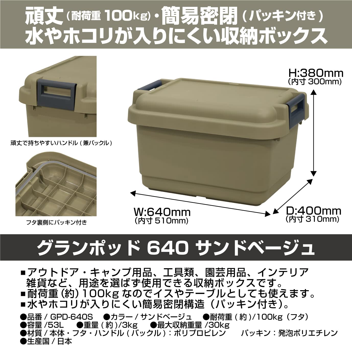 JEJアステージ 収納ボックス 日本製 簡易密閉型 パッキン付き アウトドア キャンプ スツール 耐荷重100kg 積み重ね [グランポット 53L GPD-640S] サンドベージュ 防災 幅64×奥行40×高さ38cm
