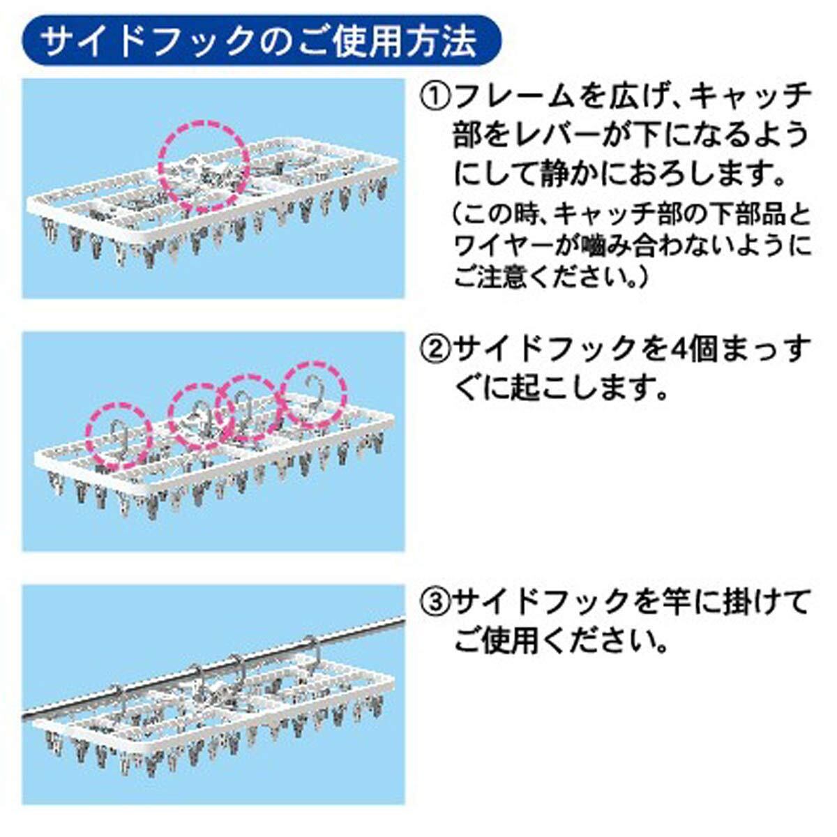キャッチ&フックを上手に使い分け! サイドフックで低竿対応、長い洗濯物も床につきにくい!