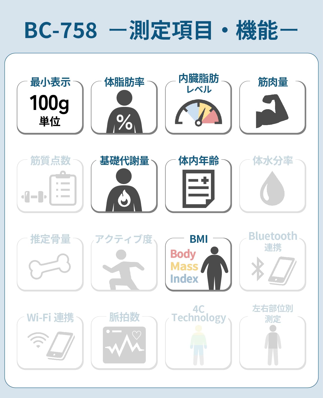 ・測定頻度に合わせて表示が変化する「マイサポ機能」で毎日の測定を応援します。 ・体重が急激に変化した場合にお知らせする「体重急激増減お知らせ機能」付き。 ・触れるだけで作動する静電式タッチボタンを採用。 ・乗るだけで測定ができる「乗るピタ機能」搭載。 ・立てかけ収納OK。