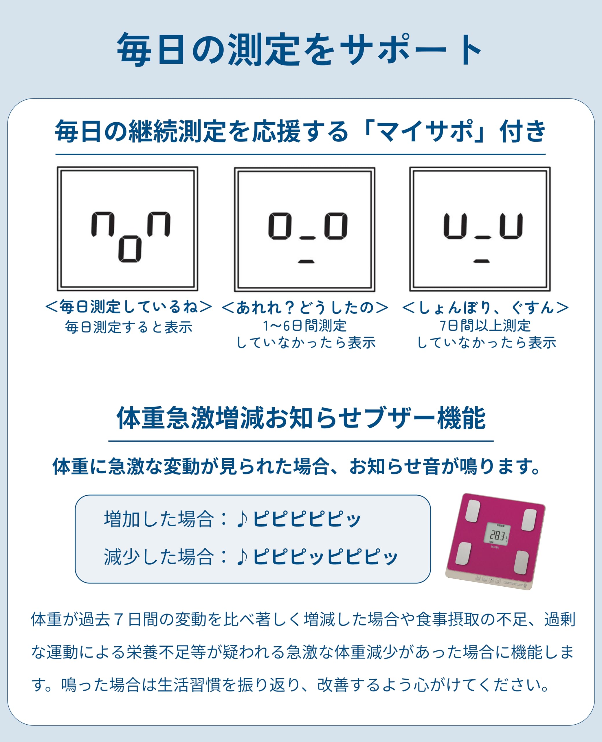 体重が急激に変化した場合にお知らせする「体重急激増減お知らせ機能」付き。