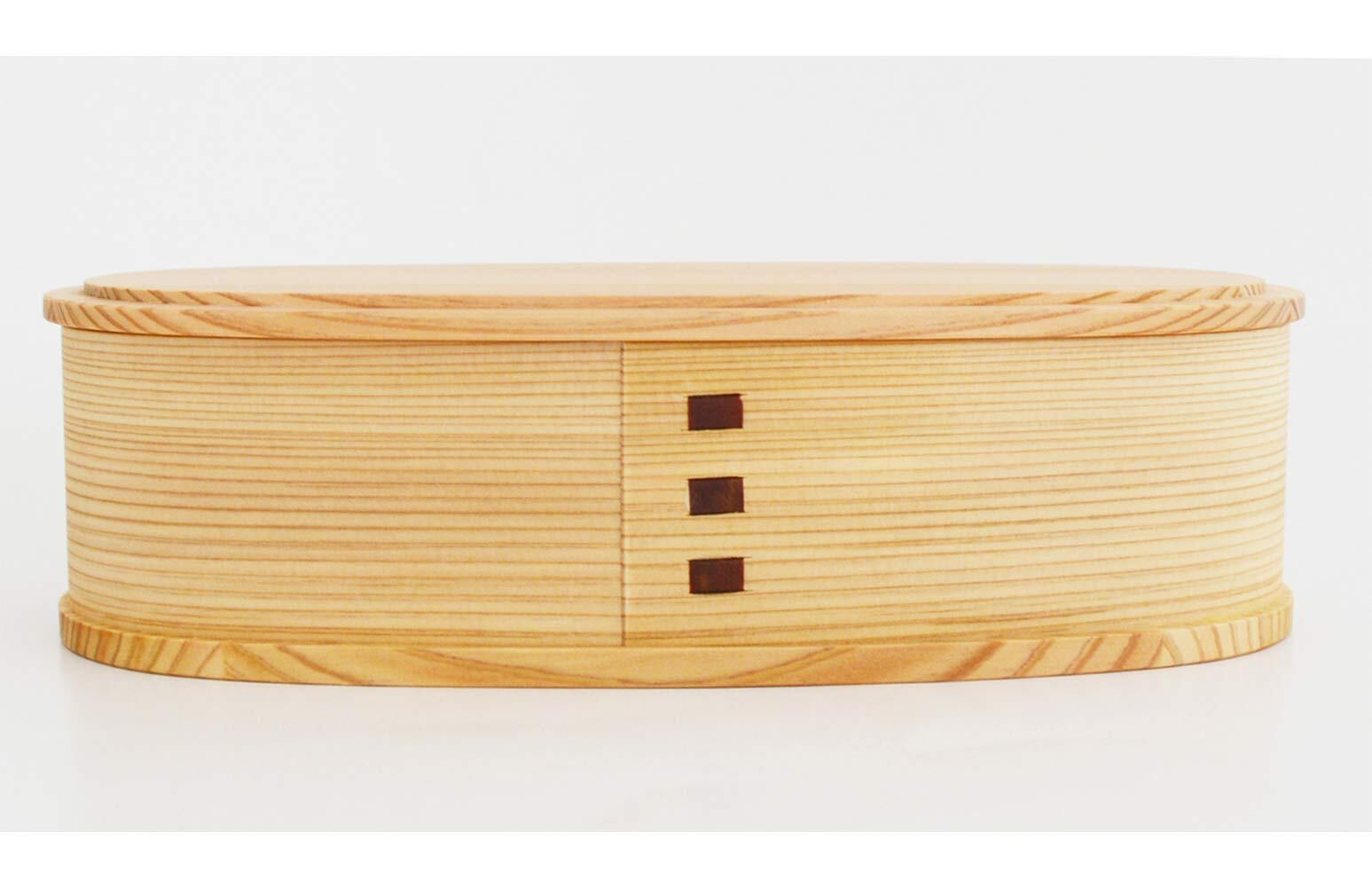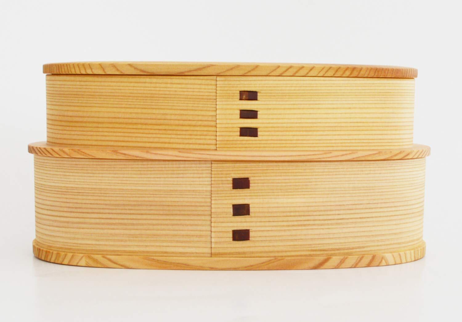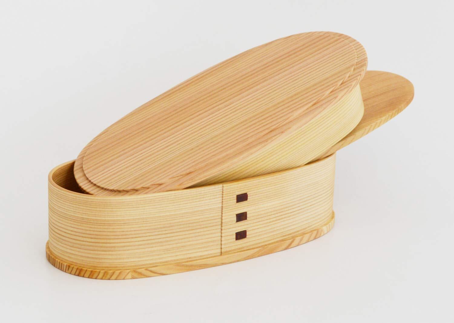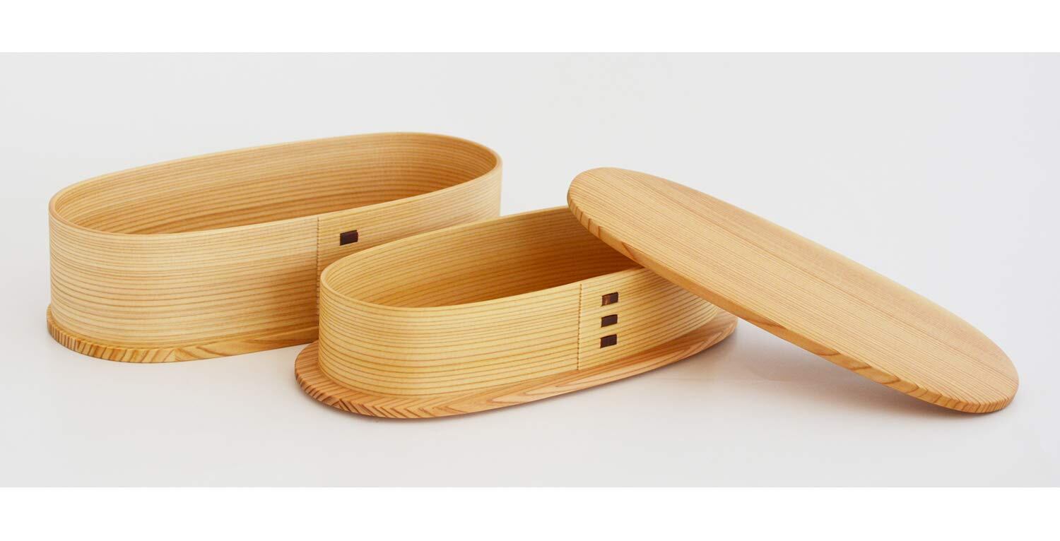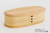 弁当箱は大館曲げわっぱのルーツともいえるアイテム。食べ終わったら入れ子にしてコンパクトに(高さ:約5.7cmになります)。