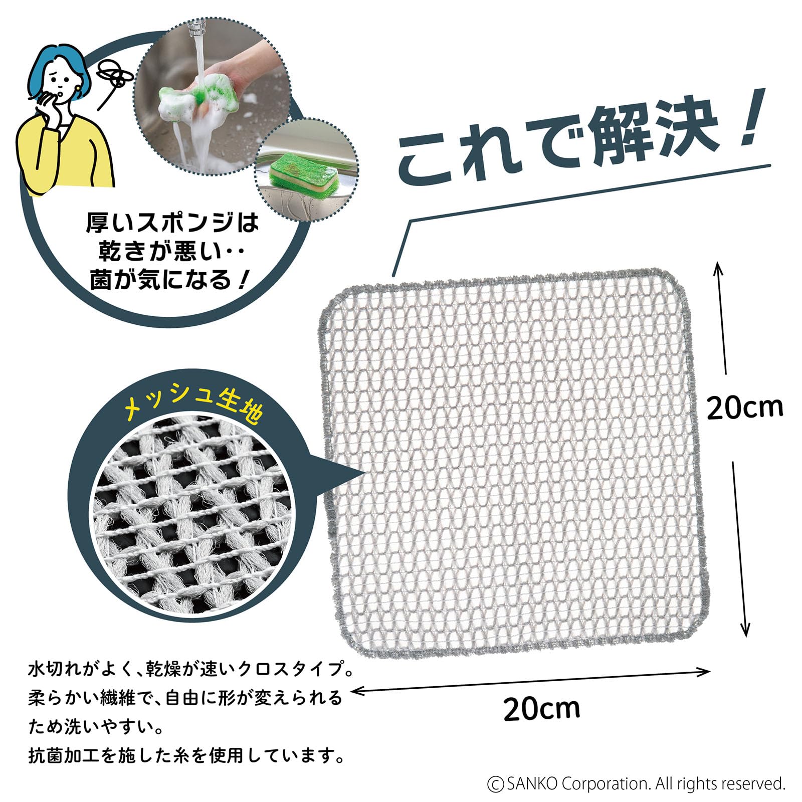 【限定セール】Sanko サンコー キッチンスポンジ メッシュクロス 水切れ 乾き 水だけでも汚れが落とせる特殊繊維 びっくりフレッシュ 抗菌加工 日本製 グレー BI-13