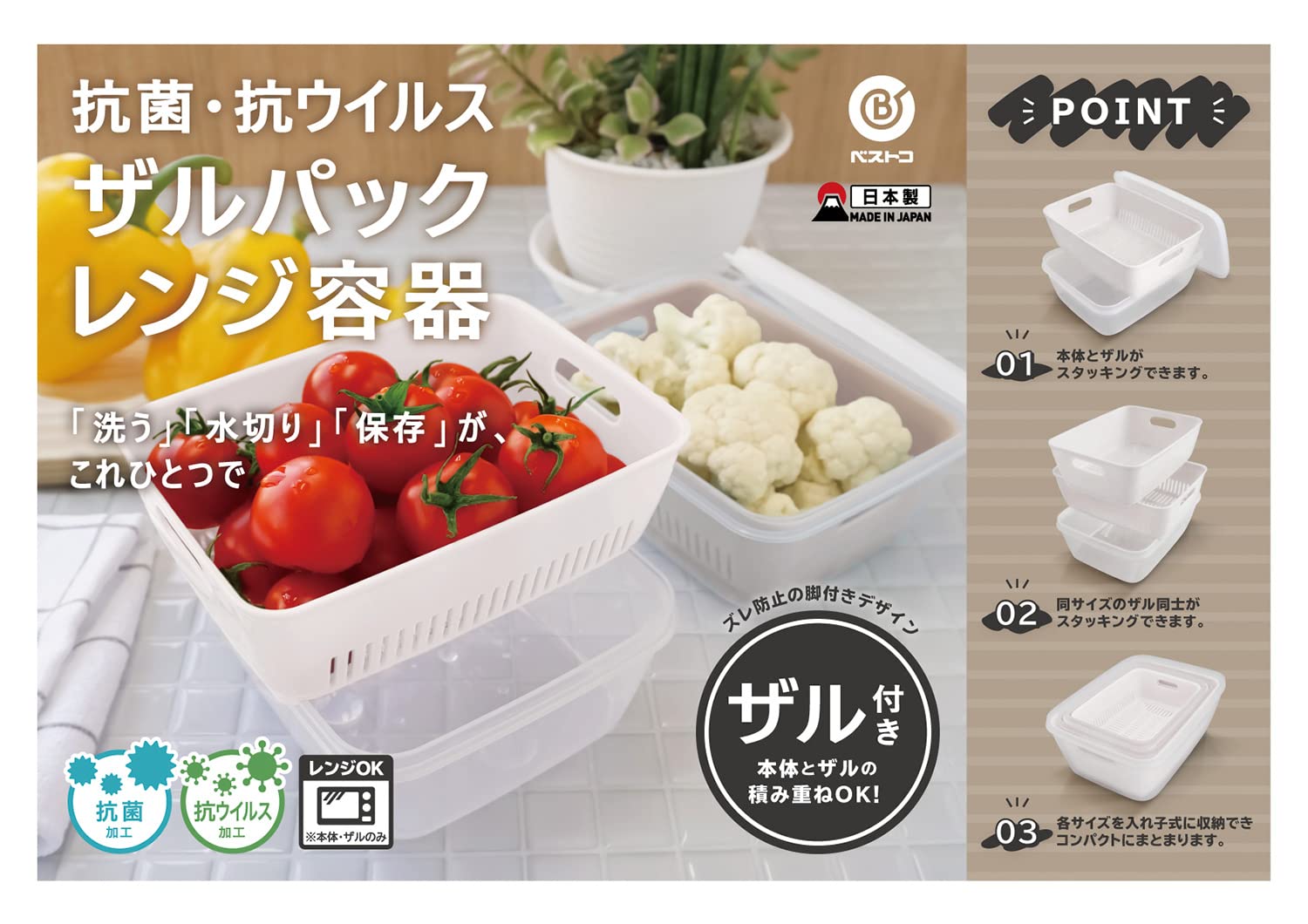 「洗う」「水切り」「保存」がこれひとつでできる、抗菌・抗ウイルス加工の保存容器です。