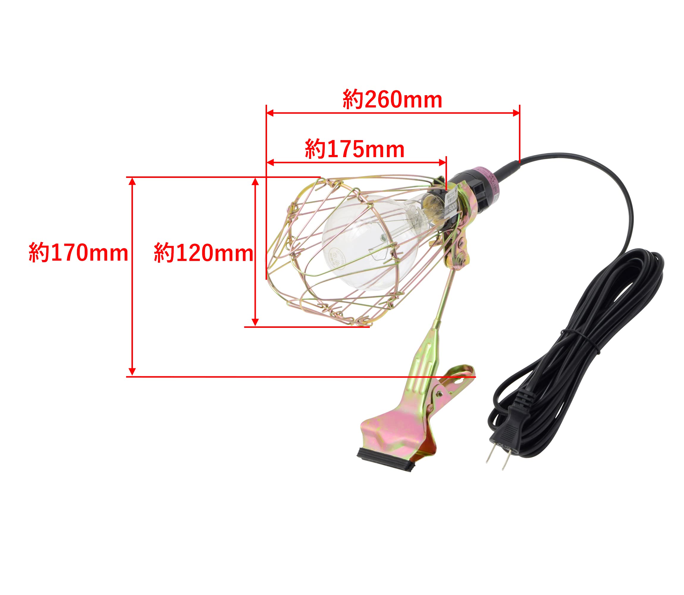 口金サイズ:E26、コード長:約5m、クリップ能力(最大):パイプφ48mm/角材 厚さ40mm