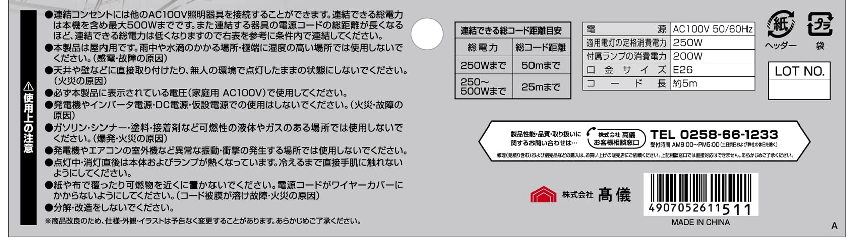 電源:AC100V 50/60Hz、適用電灯の定格消費電力:250W、付属ランプの消費電力:200W