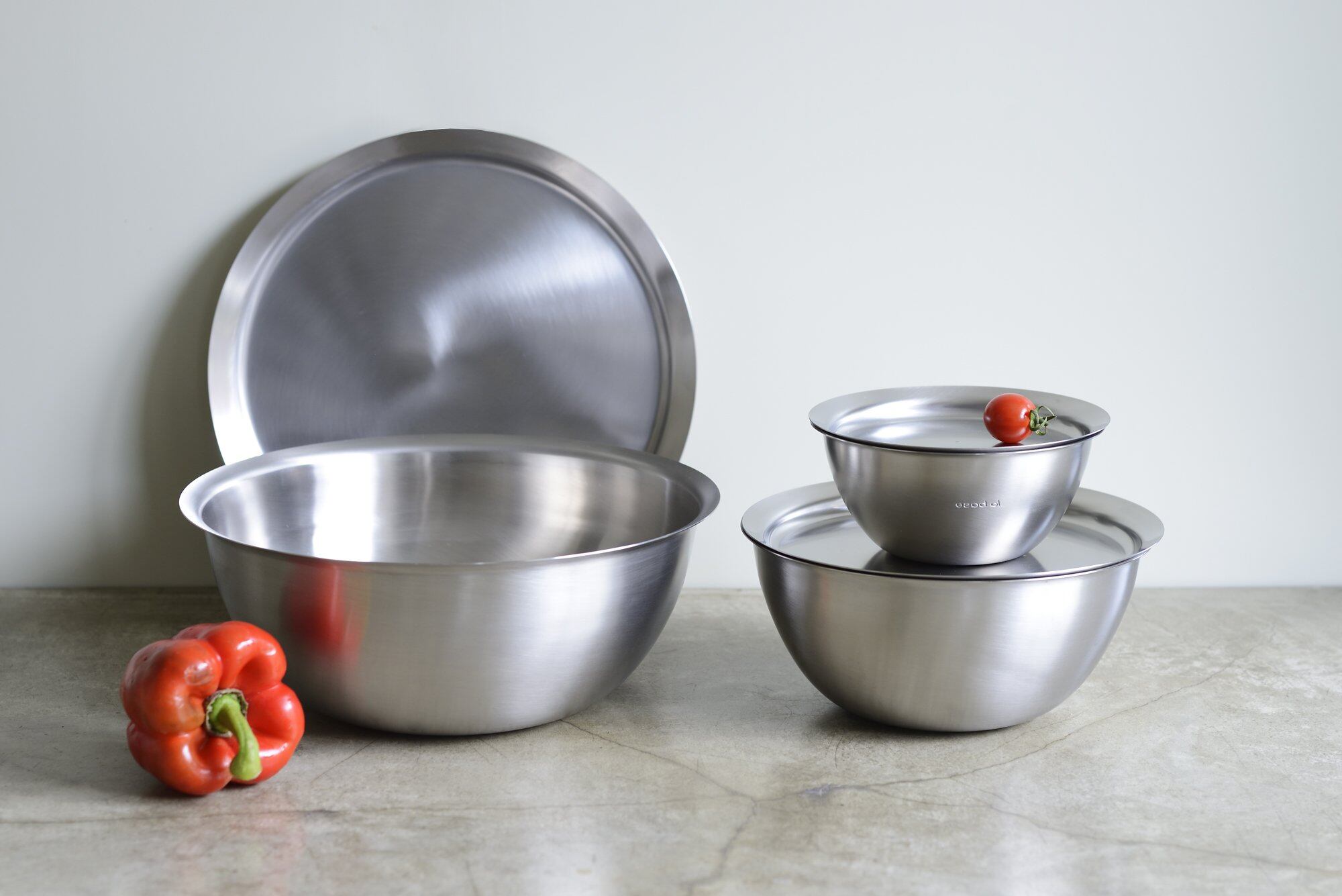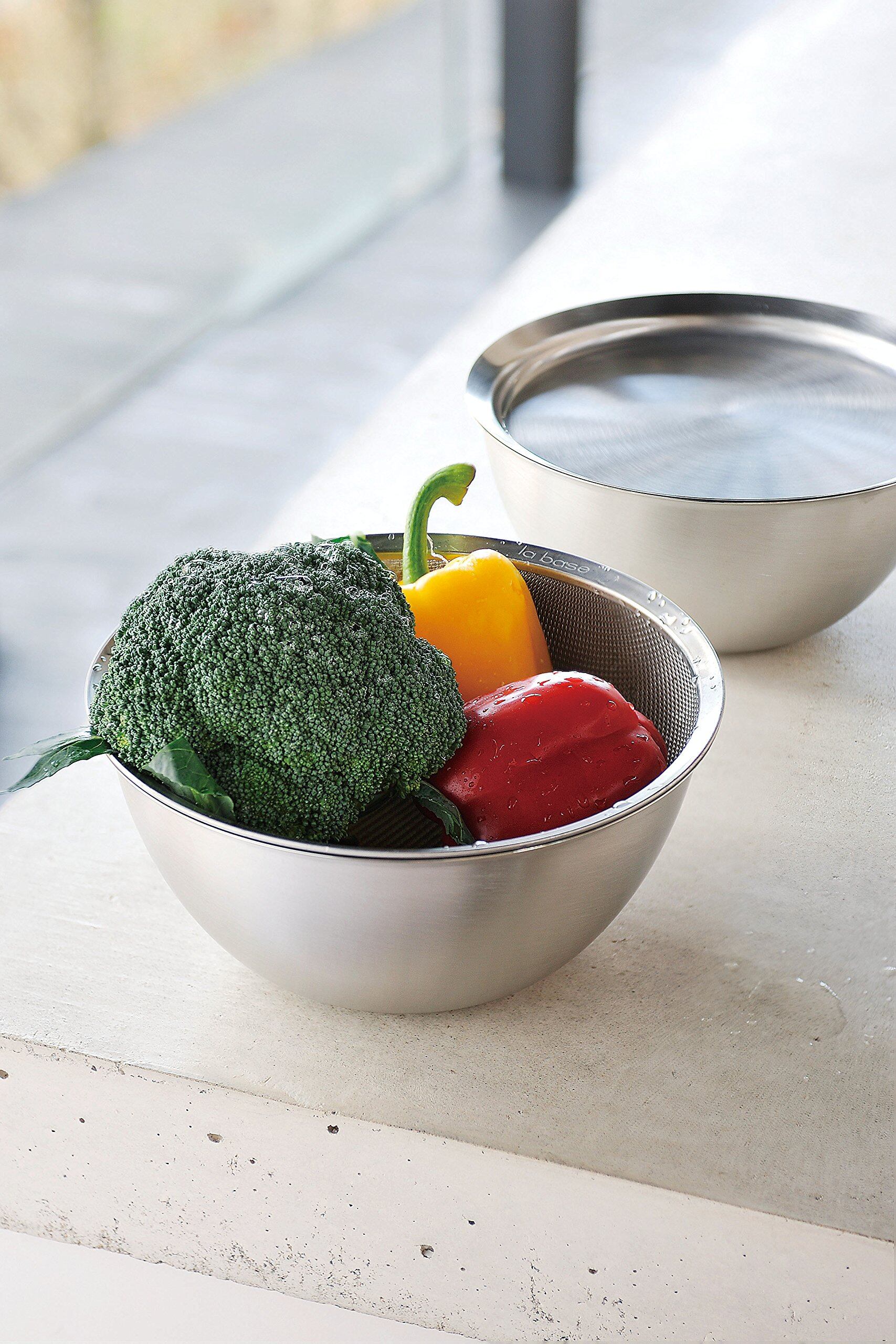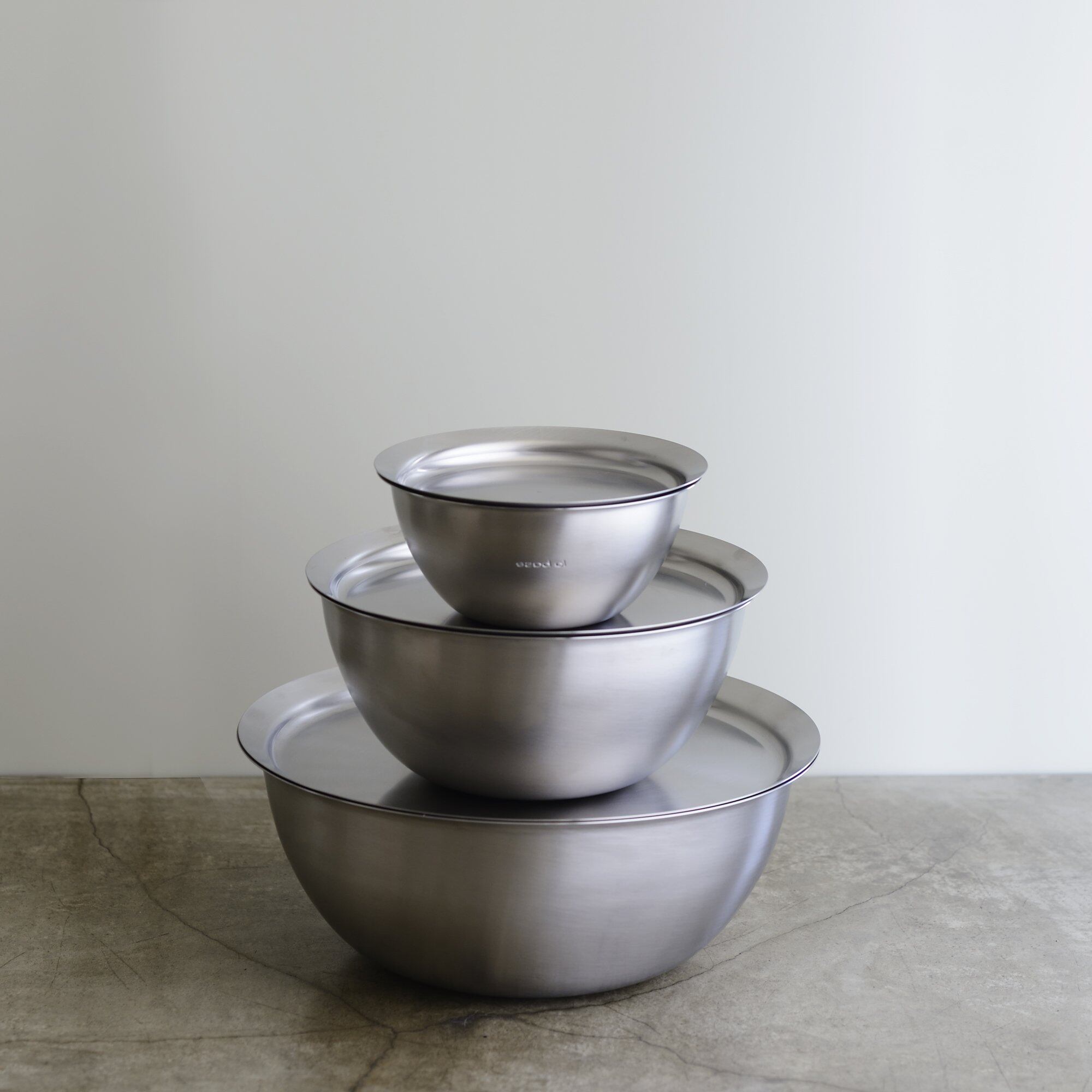 中サイズは、材料を混ぜる、泡立てる、汁物などを入れるなど広範囲に使えるなくてはならないサイズです。 同サイズの丸ざる、浅型ざるやプレートと組み合わせると、使い方が広がります。 出汁を取る時は、同サイズの浅型ざるを重ねて使用します。 ボウルにプレートで蓋をすれば保存容器として使え、重ねられるので省スペースで調理台が広く使えます。 ・ボウルシリーズは大(27cm)、中(21cm)、小(15cm)の3種類です。 ・縁の巻き込みを無くし汚れがたまりにくくしました。 ・縁のデザインは、持ちやすいように角度と幅にこだわりました。 ・一般的なボウルの約2倍板厚0.8mmです。スピニング加工という製法で、底や縁は厚みを残して安定感をもたせ、側面は薄く延ばすことで軽さを出しました。 ・表面はヘアライン仕上げなので、艶消しの上質感があります。 ・耐久性に優れた18-8ステンレス鋼を使用しています。