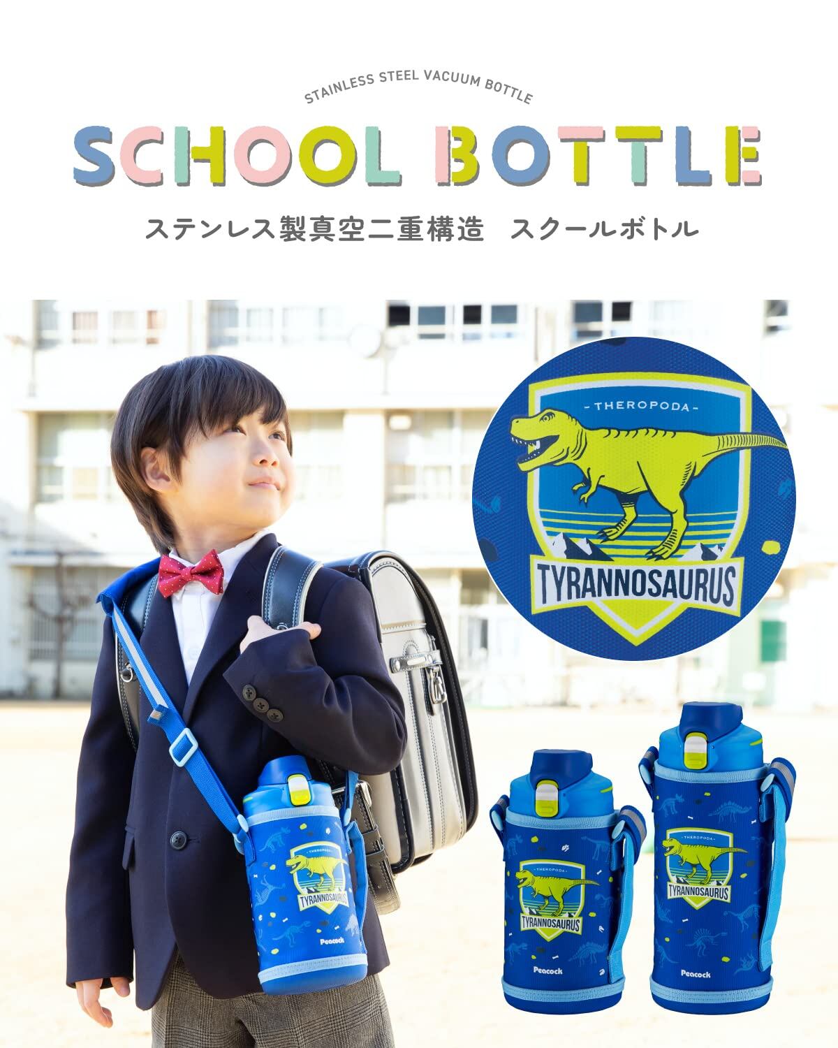 ピーコック スクールボトルは真空断熱構造のステンレスボトル でワンタッチオープンで簡単にフタが開きます。直接飲み口に口を付けて飲めるダイレクト直飲みタイプです。 恐竜 ティラノサウルスデザインのポーチ付き水筒です。