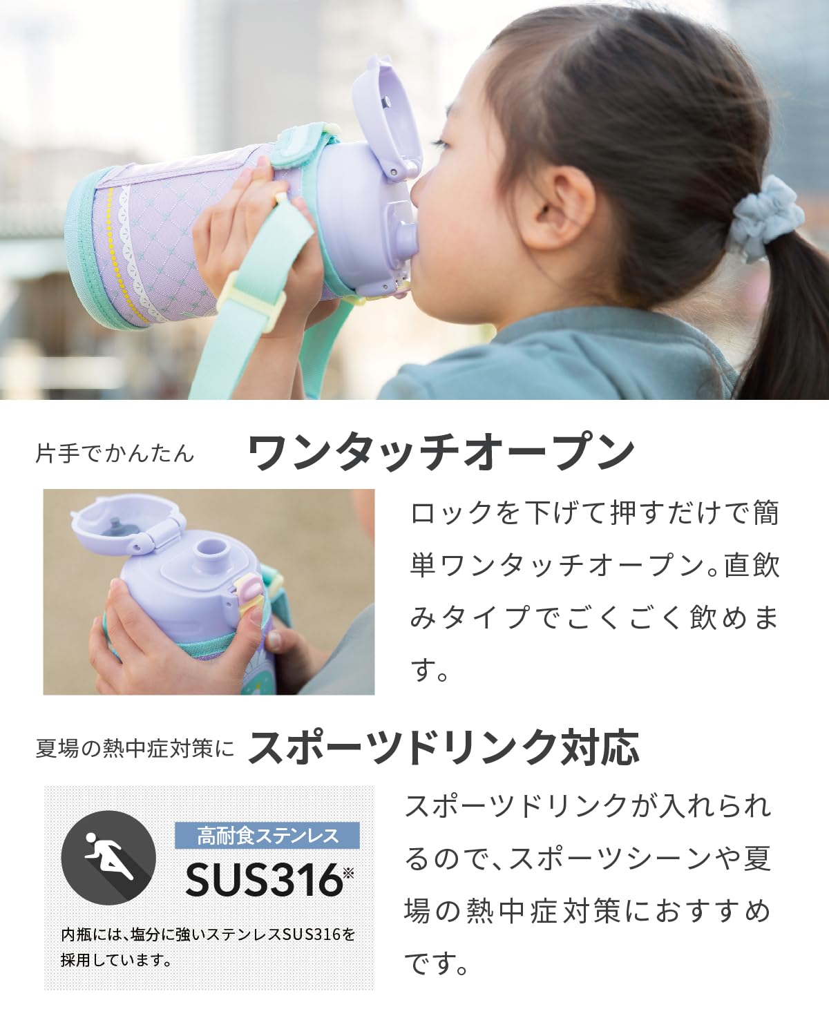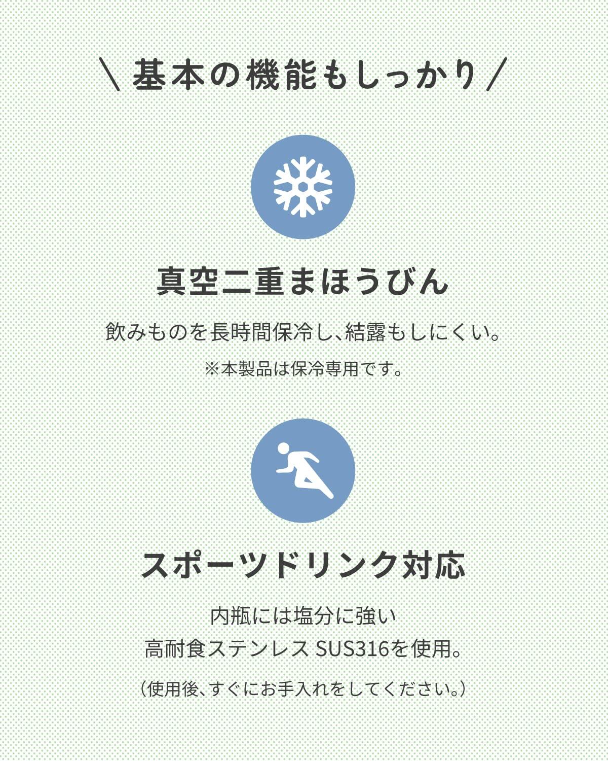 ステンレス真空断熱構造でしっかり外気温を遮断、保冷効果に優れています。 ●ワンタッチオープンなので操作性も簡単。 ●直飲みができるキャップ形状。 ●内瓶には高耐食ステンレスのSUS316を使用しているのでスポーツドリンクにも対応。
