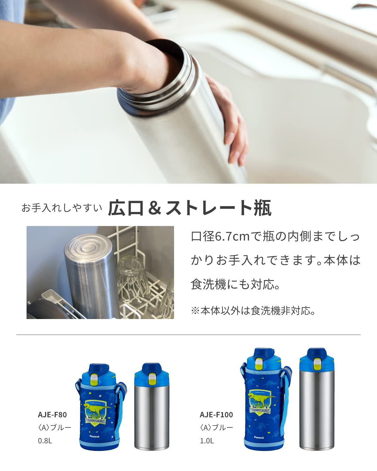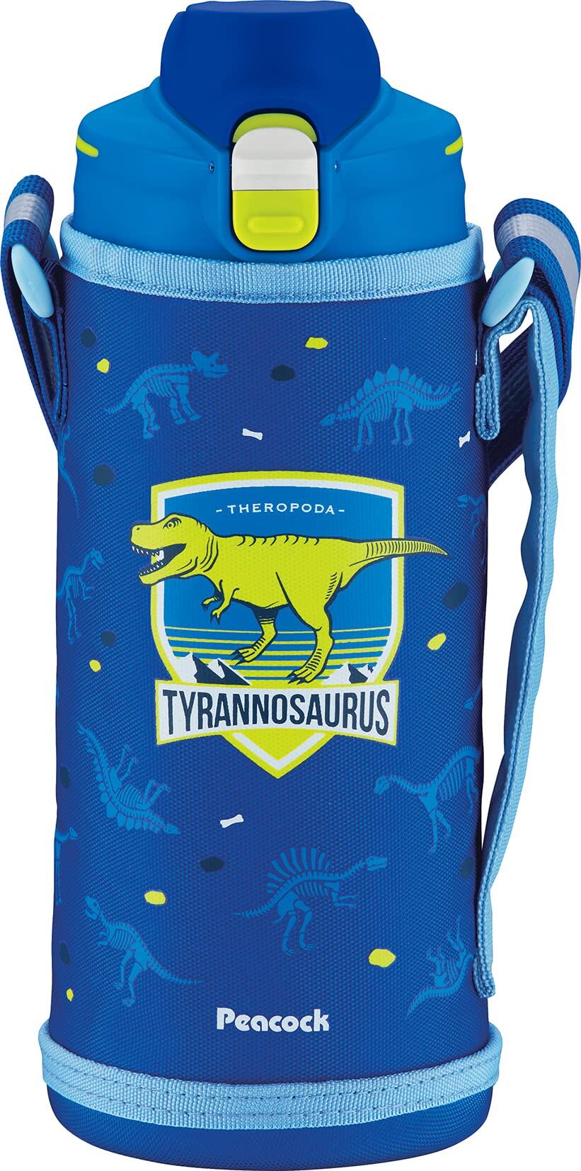 ピーコック 水筒 子供 保冷 保温 1000ml ワンタッチ 直飲み 男の子 キッズ ステンレス 広口 魔法瓶 マグボトル 1L ブルー 恐竜 AJE-F100 A
