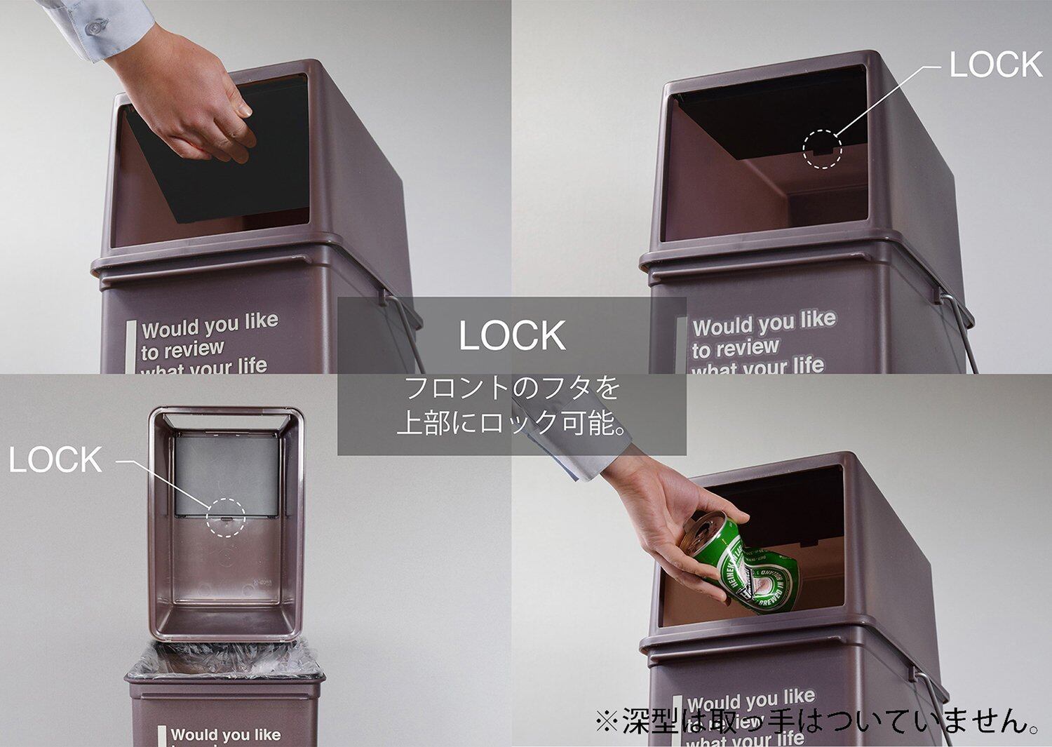 捨て口のフロントのフタはロック可能。一度に多くのゴミを捨てたい時や料理中で手が汚れている時に便利。