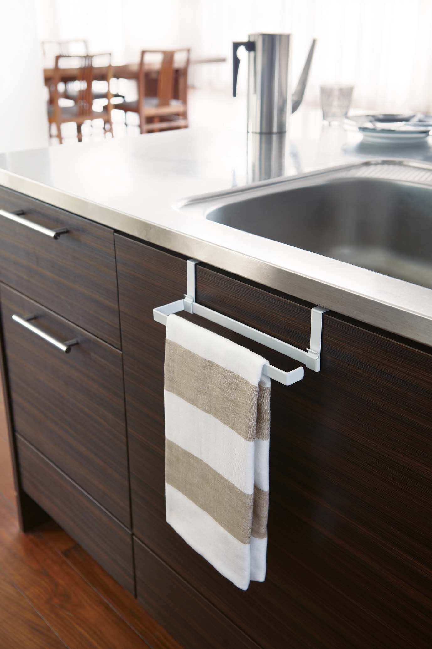 キッチンペーパーやタオルが掛けやすいコの字型。ハンガーには返しが付いているので、掛けたものが落ちにくい仕様