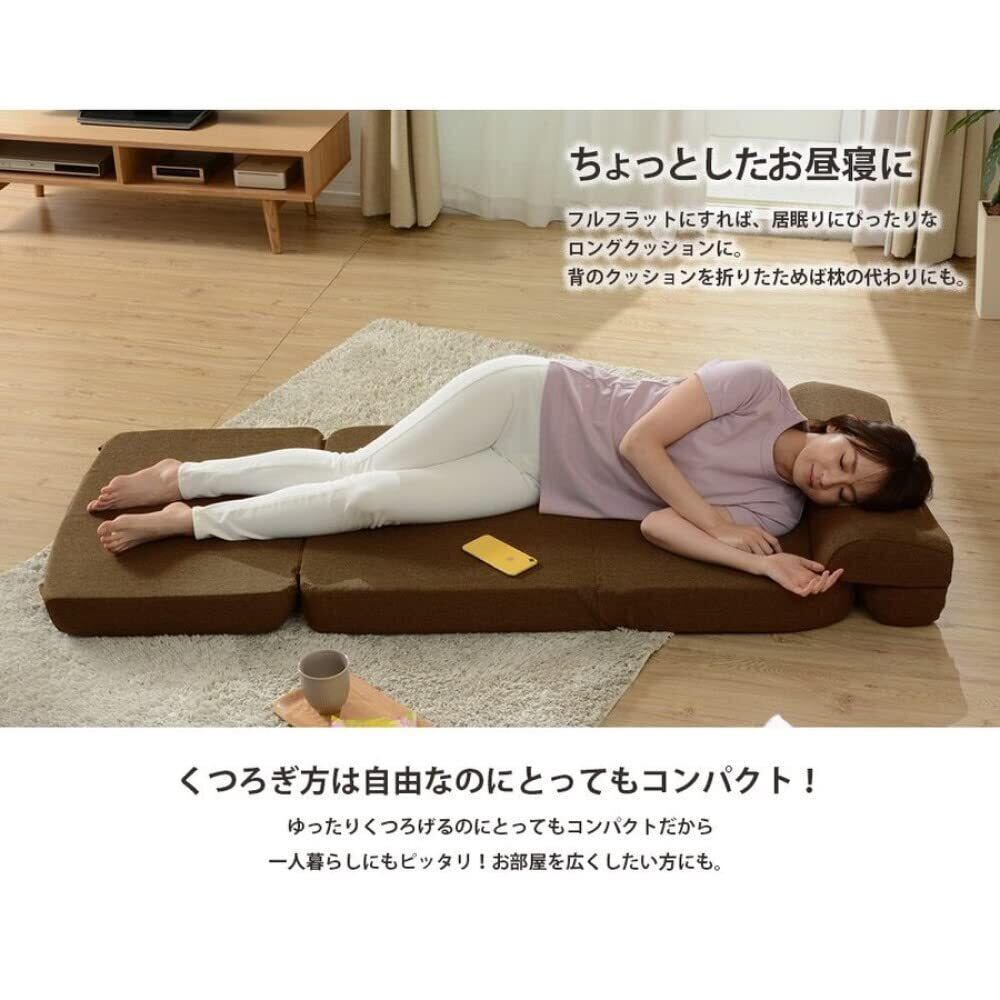 背を折るとソファーに、脚を伸ばすとローソファーに、全て伸ばすとマットとして使用できます。