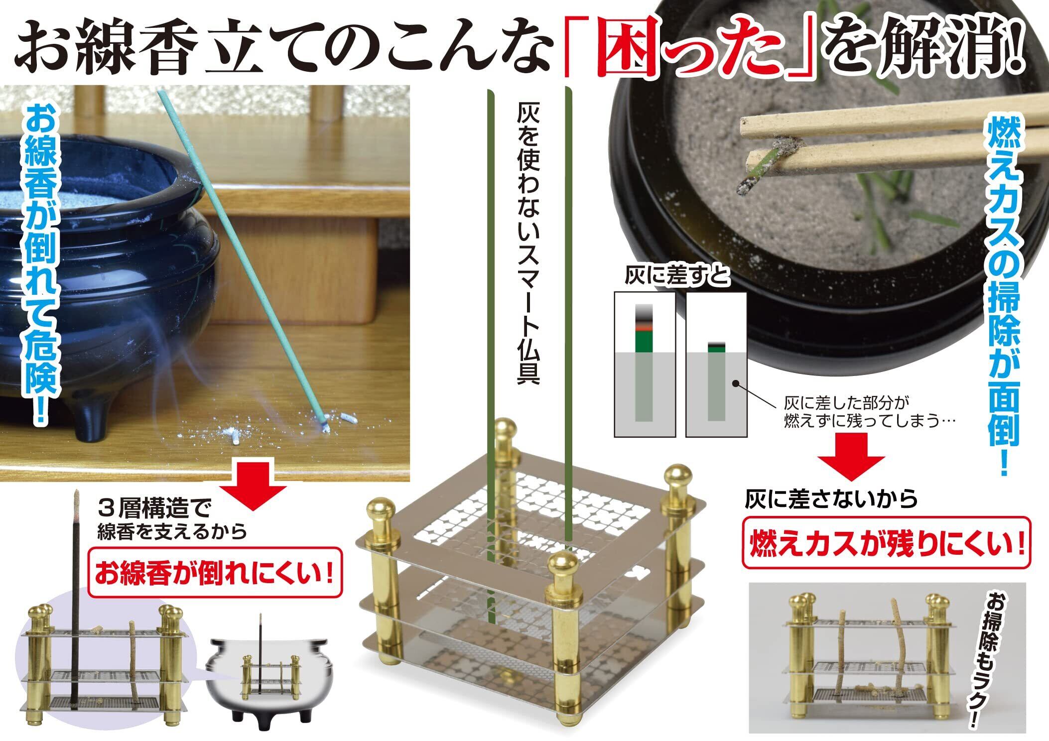 ●灰いらずで美しく。燃え残りにくい! ●お線香の危険・面倒を解消して、美しく立てられる線香立て●3層構造で支えるから、傾いて灰が散らかったり倒れたりするのを防止します。●線香をまっすぐ立たせる線香立て。
