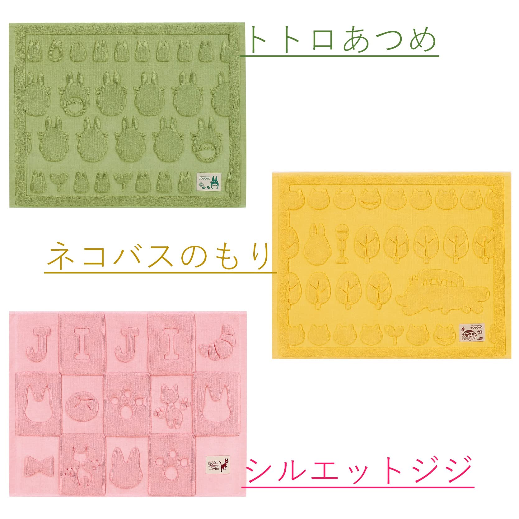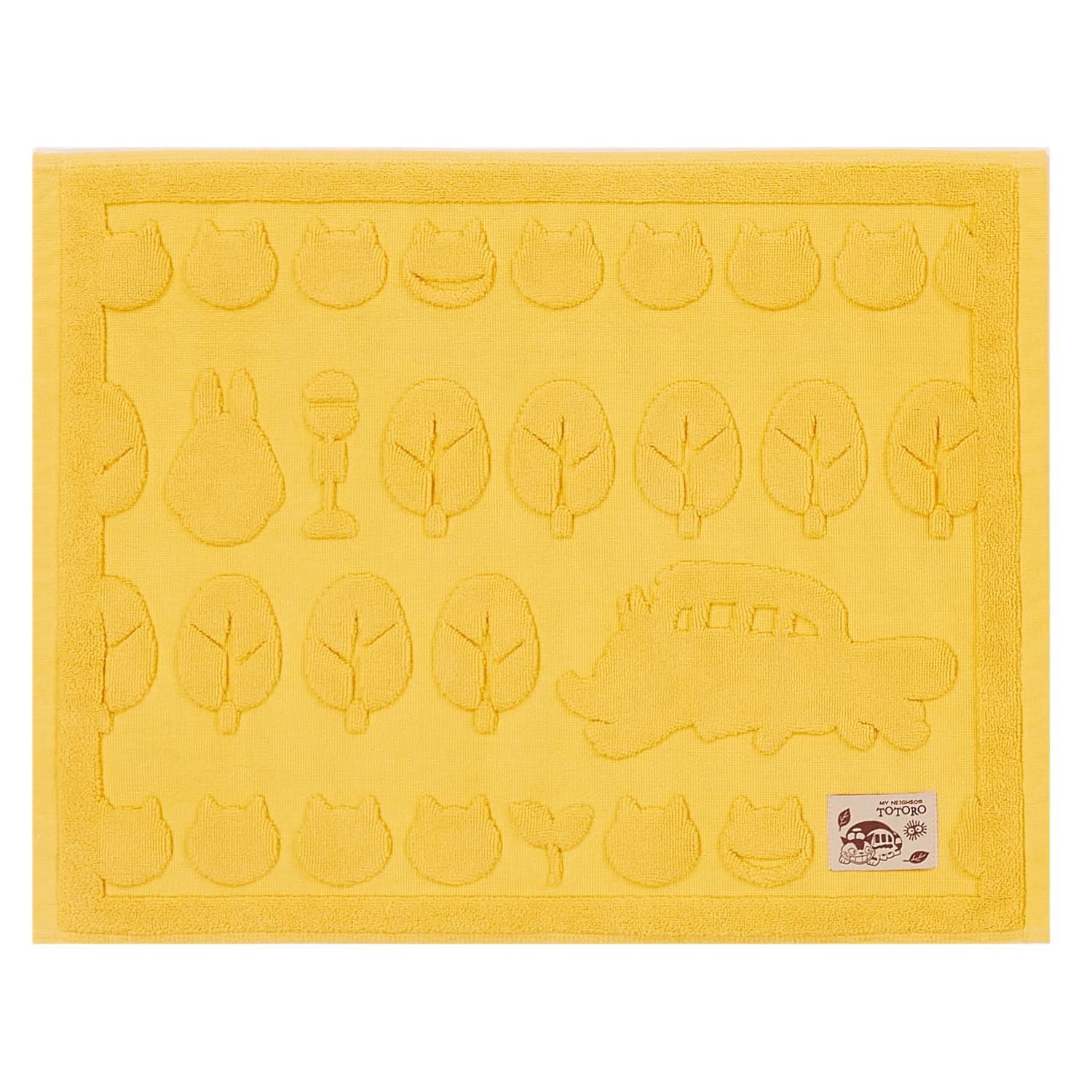 森の中を走り回るネコバスのシルエットを凹凸で表現したタオル地マット。コンパクトに折りたためて洗濯や収納が簡単。