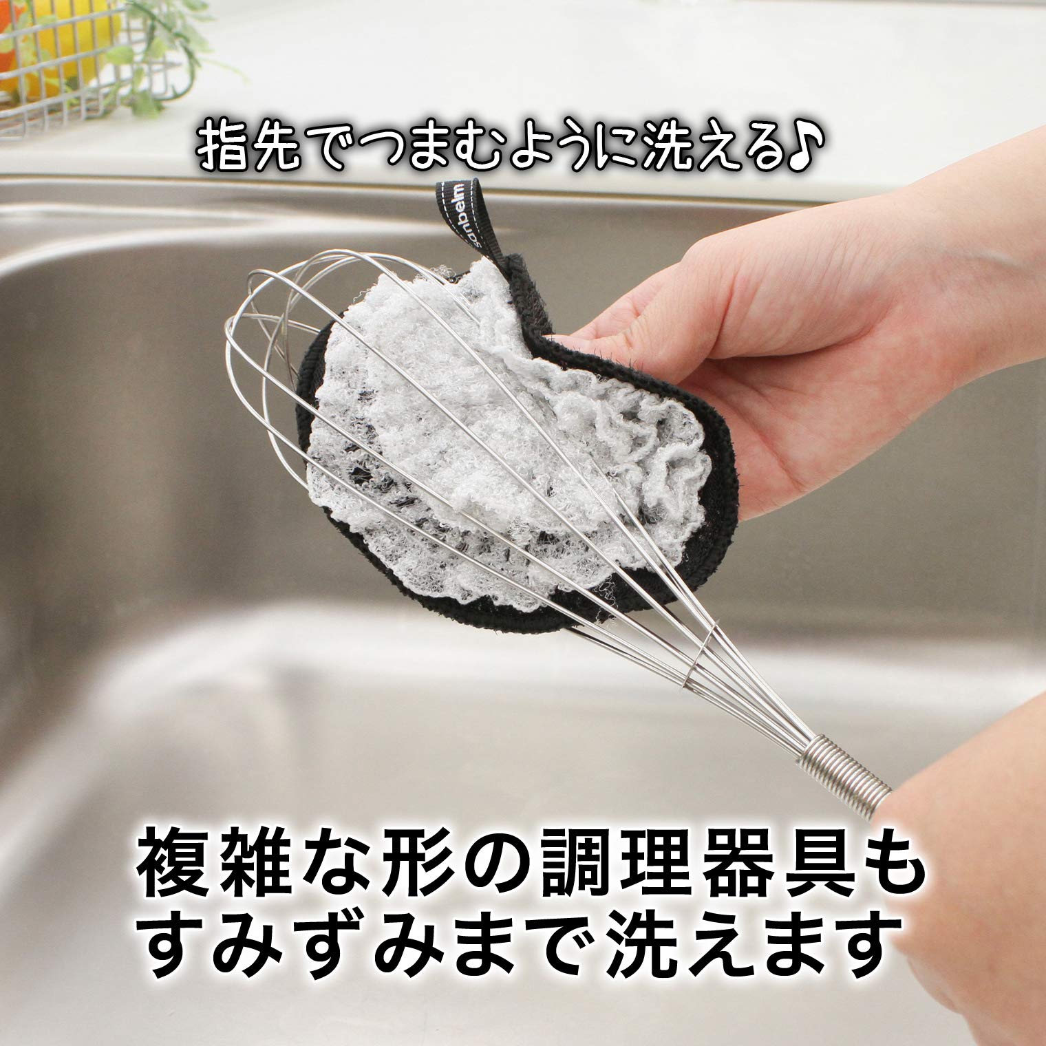裏面のチクチク部分がザルなどの網目にブラシのように入り込んで汚れを落とす。