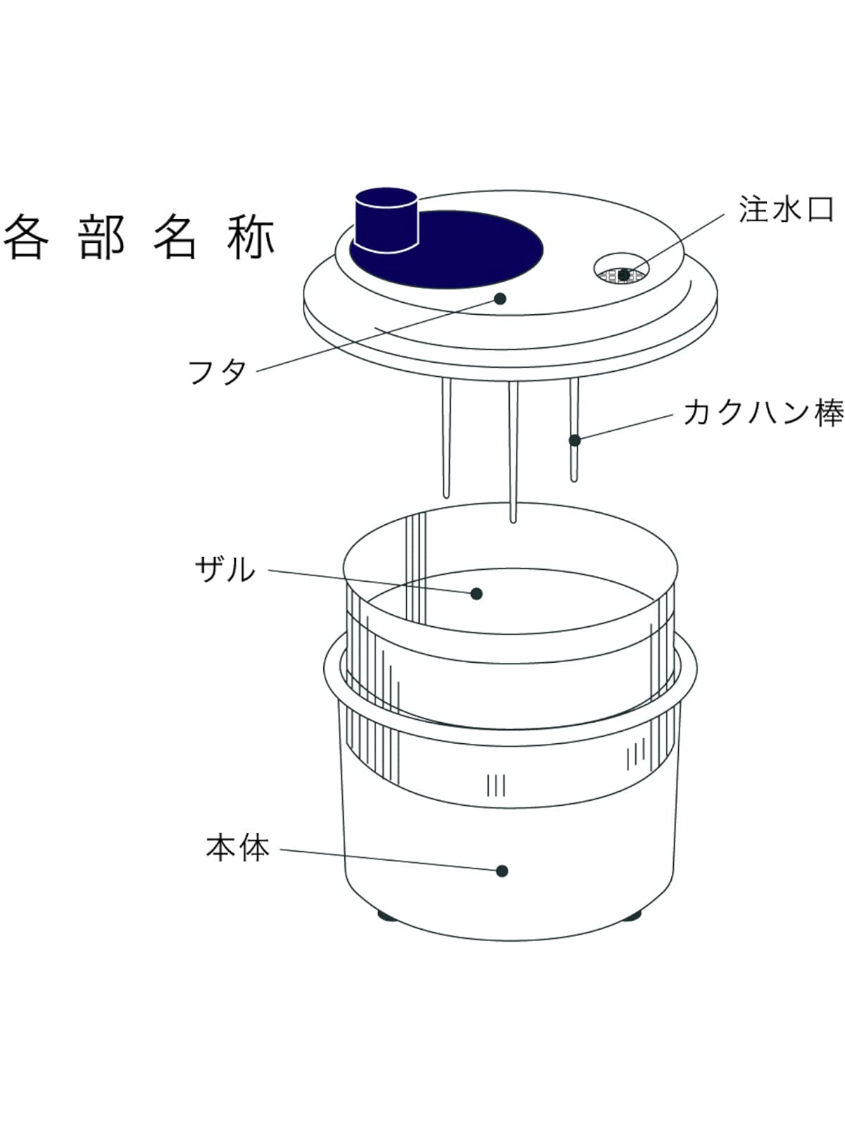 素材:本体・蓋・ザル・つまみ/ポリプロピレン、ゴム脚/ウレタンゴム、カクハン盤/ABS樹脂