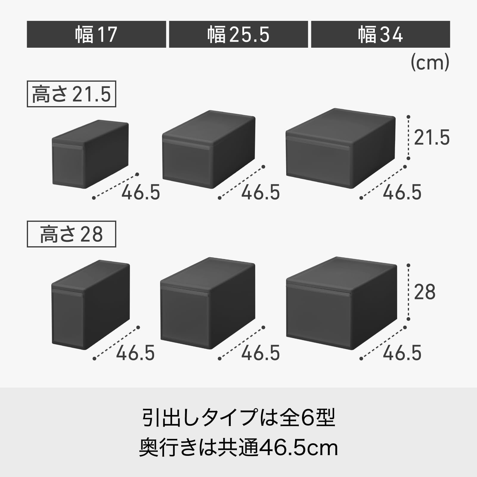 ブロック式構造で組み合わせ自由自在の引き出し収納ユニットで、収納物や設置場所に合わせて3種類の幅の異なる引出しを組み合わせ可能です。幅が同じ物であればしっかりジョイントもできます。別売のキャスター・アジャスター取り付け可能です。奥行き46cmタイプのメタルラックにもピッタリな収納ケースです。