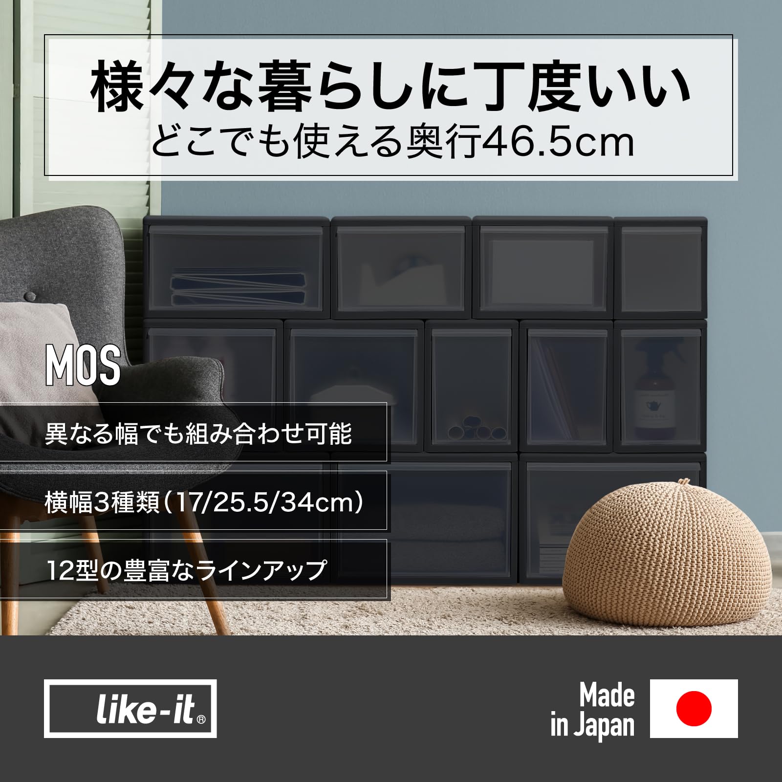 ライクイット (like-it) 家中置きたい場所にちょうどいい 収納ボックス 組み合わせて使える 収納ケース スリムL グレー 日本製 MOS-04 奥行き約46.5cm クローゼット メタルラック 衣類収納 引出し収納