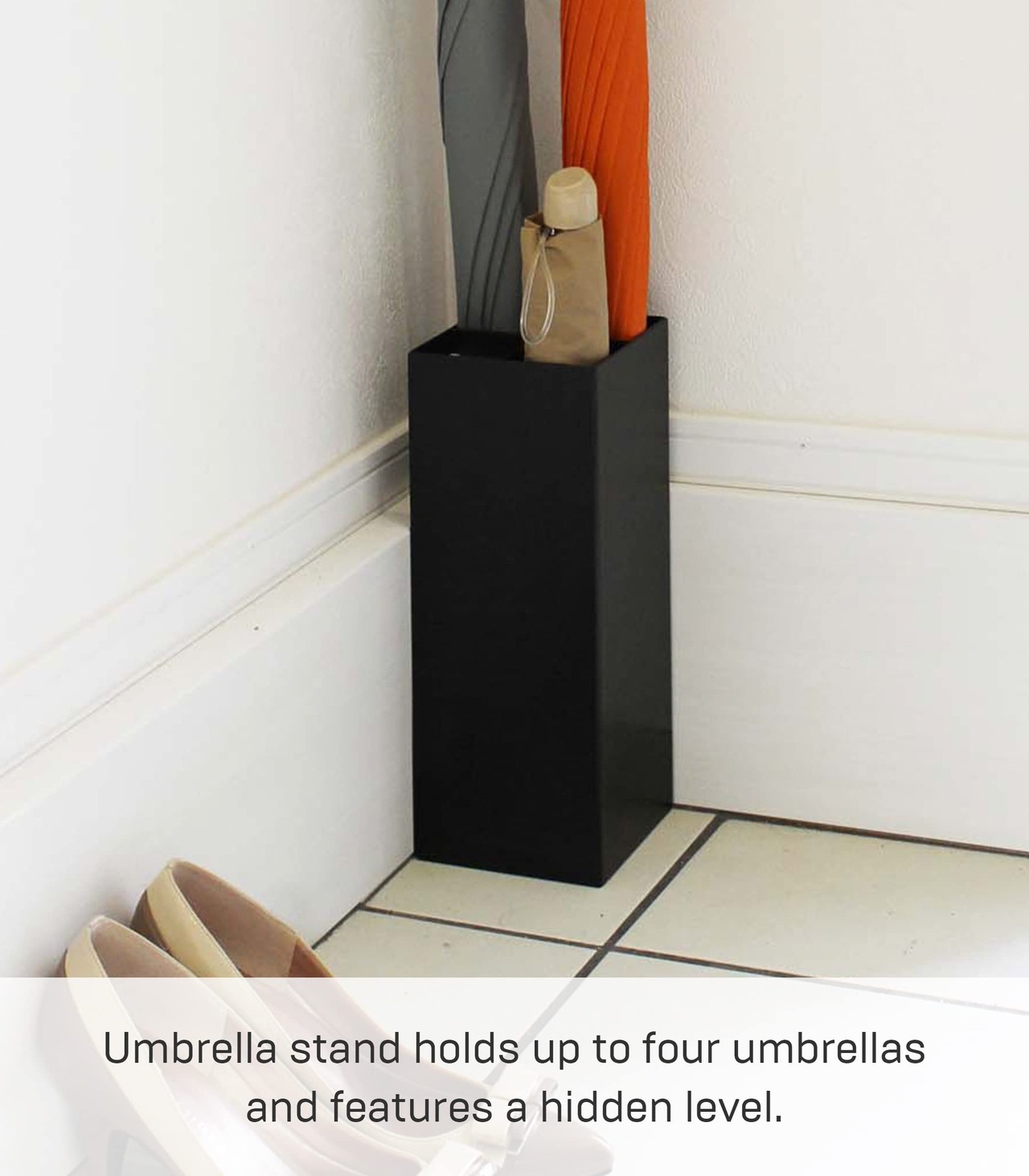 玄関の角にぴったりと収まるコンパクト角型かさたて。