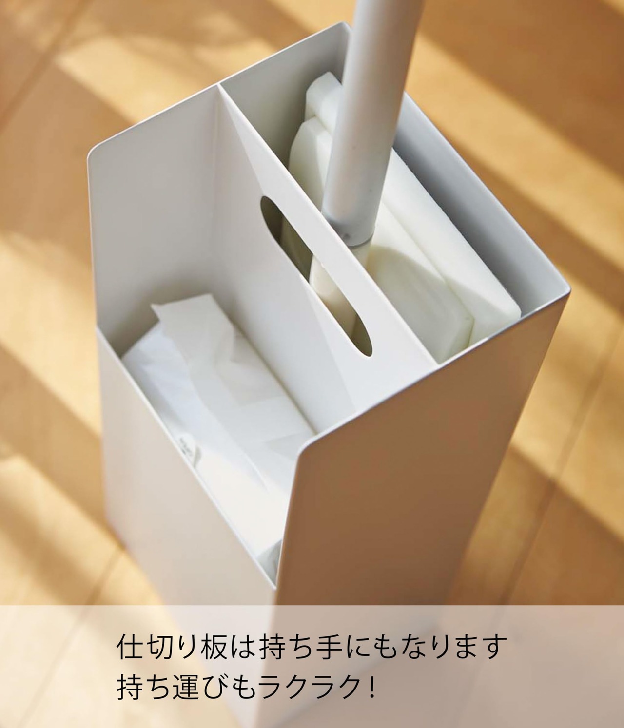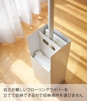 ◆フローリングワイパーと取替えシートをすっきりまとめてコーナーに収納! ◆置き場所に困っていたフローリングワイパーや取替えシートが一緒にすっきり収納できます。◆仕切り板には持ち手となる穴が空いているので持ち運びもラクラク! / ■ 仕 様 ■サイズ(約):幅11×奥行9×高さ26cm 質量(約):750g 材質:スチール(粉体塗装) /