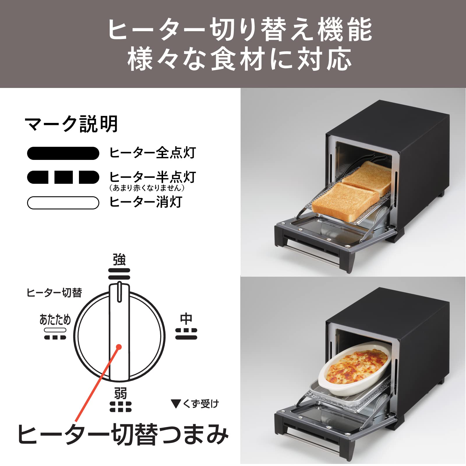 強、中、弱、あたための4段階出力切替