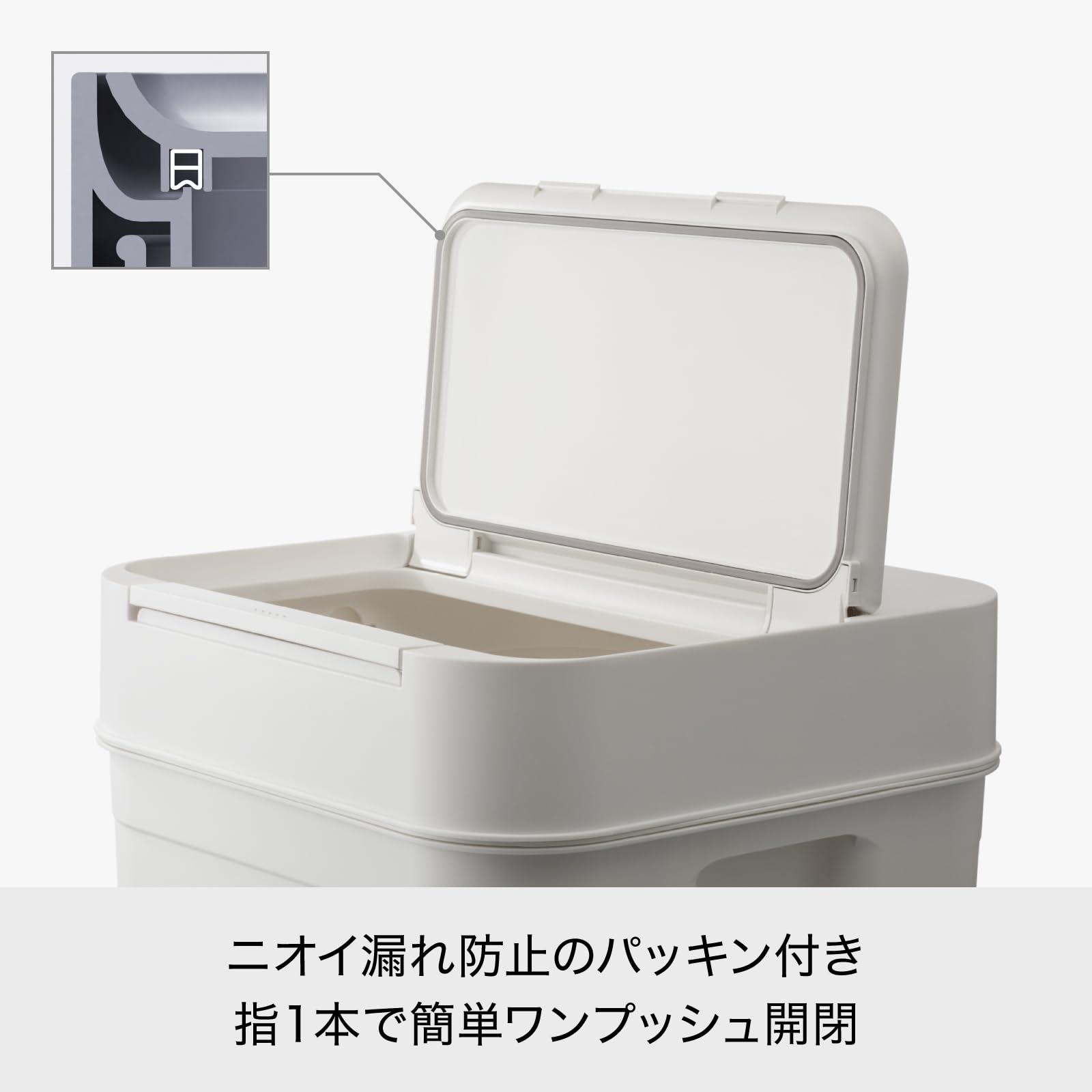 ニオイにフタするスリムデザインのダストボックス。特徴1:シリコンパッキン(ニオイ漏れ防止)構造。特徴2:ワンプッシュで大きな間口が開閉。特徴3:袋クリップホール構造でゴミ袋の設置楽々。特徴4:スリット構造でダスト内分別(2種類まで)が可能。