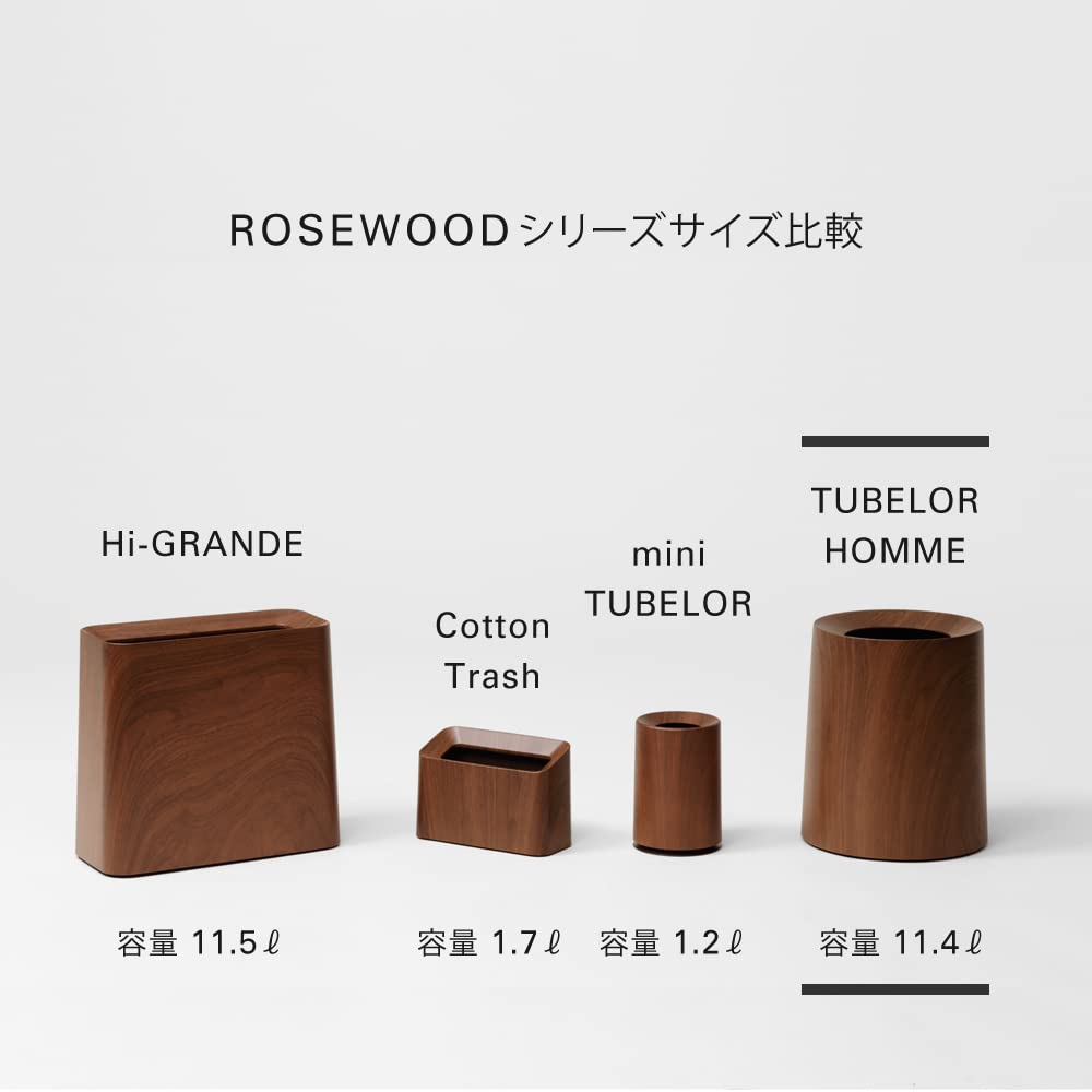 リビングスタンダードなゴミ箱TUBELOR HOMME、Hi-GRANDEにローズウッドをフェイクする木目を施した。ローズウッドは過剰な伐採のなか絶滅が危惧されred listに登録されている樹木で、その産地であるブラジル、東南アジアでは輸出が禁止され保護樹木となっている。クラシックからモダン、レトロインテリアまで様々なインテリアシーンに調和する。