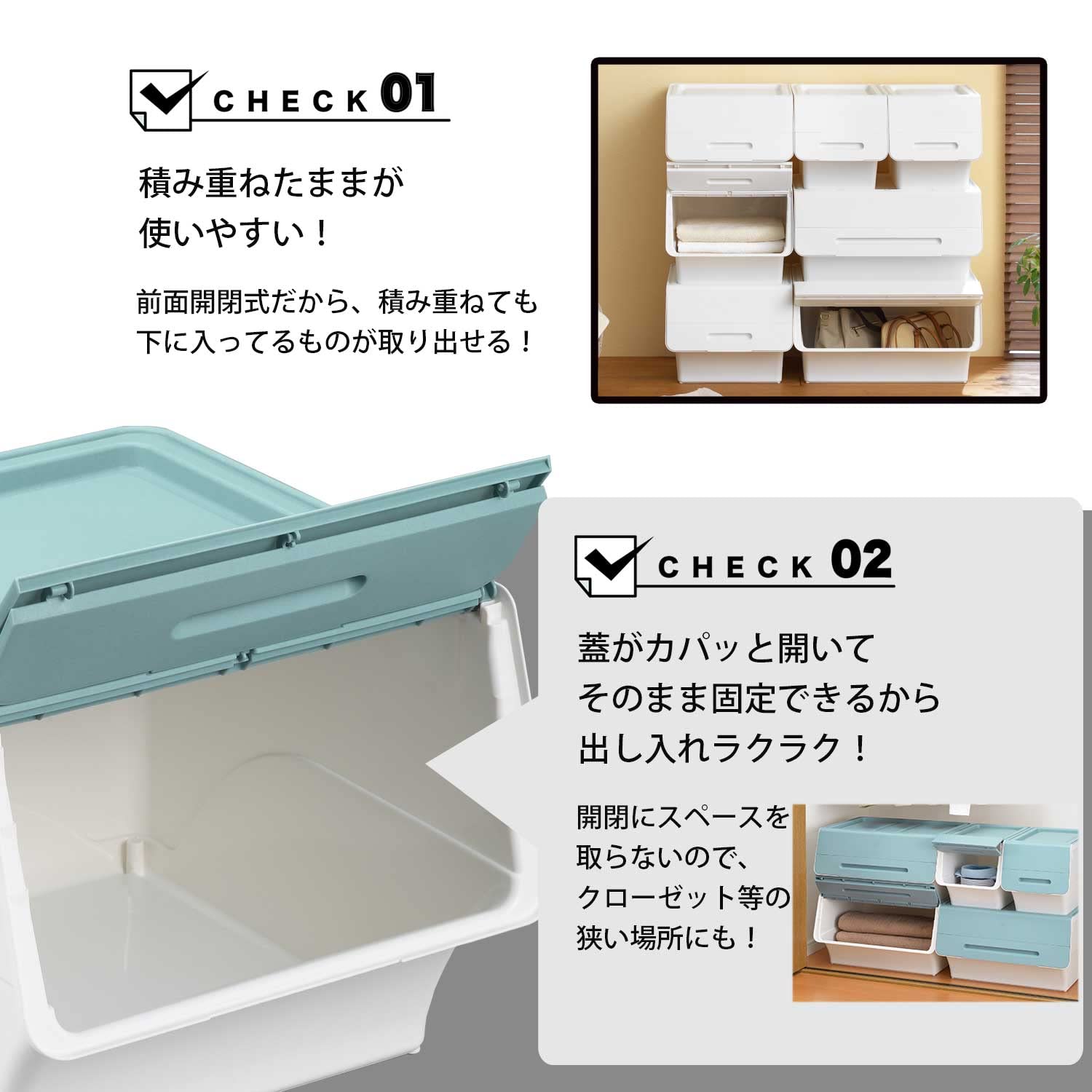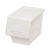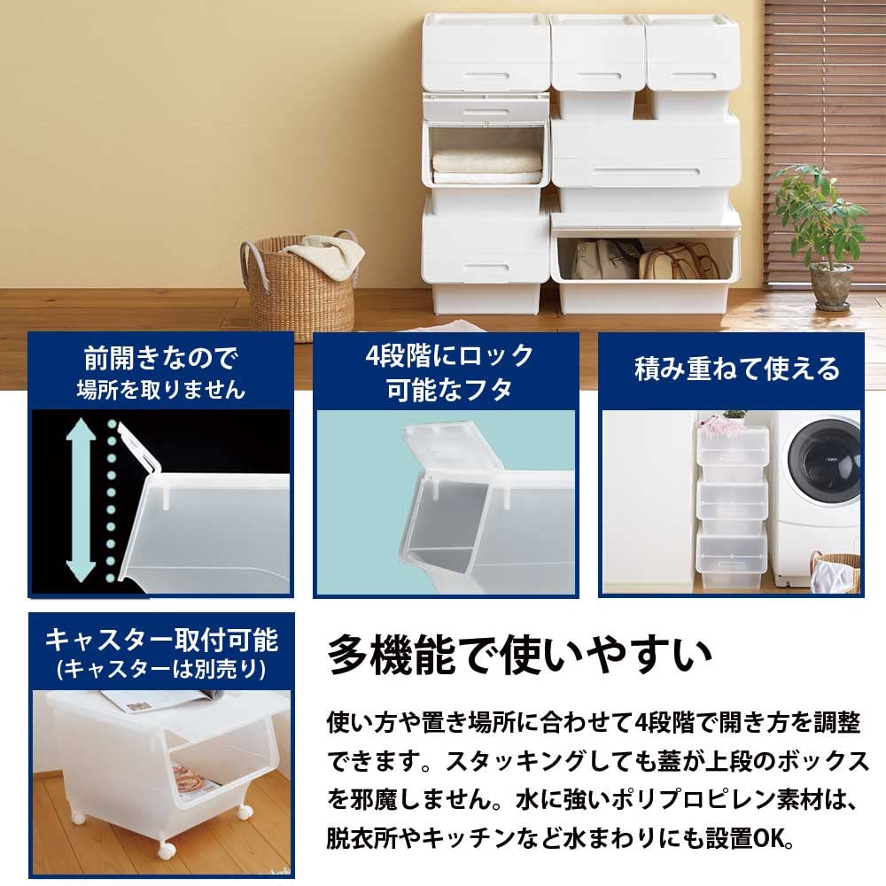 ●使用シーンに合わせて積重ねができる新しい収納のカタチ、【フロック】の収納ボックス! ●リビングや押入収納、キッチンサイド収納、分別ペール、洗面台横の収納、タオルなど浴室周りの収納など用途いろいろ! ●正面開閉のフタで取り出しやすい! スタッキングしたままでも中身の取り出しが可能 ●フタが4段階で開閉し、空いた状態でカチッと止まるから中身がとっても出しやすい! ●スタッキングして利用すれば省スペースでしっかり収納できる ●積み重ねて収納しても、下段から物を取る際に上段を動かさずに取り出しできる ●アクティブキャスター(別売)で移動ラクラク! 収納ケースに物を入れたままでも簡単に移動できる