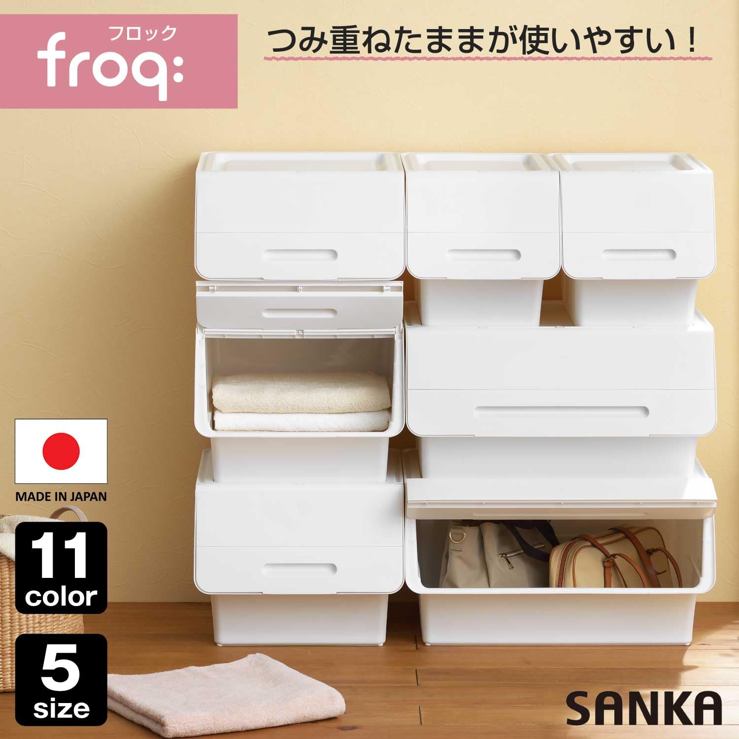 【新着商品】サンカ フロック 重ねて使える蓋付き衣装ケース スリム ホワイト おしゃれな大容量収納 引き出さずに使える前面開閉式 カパっとひらく固定できるフタ キャスター取り付け可能 日本製 衣類 収納ボックス (幅28.5×奥行46×高さ31cm) froq fr-S30NWH/WH