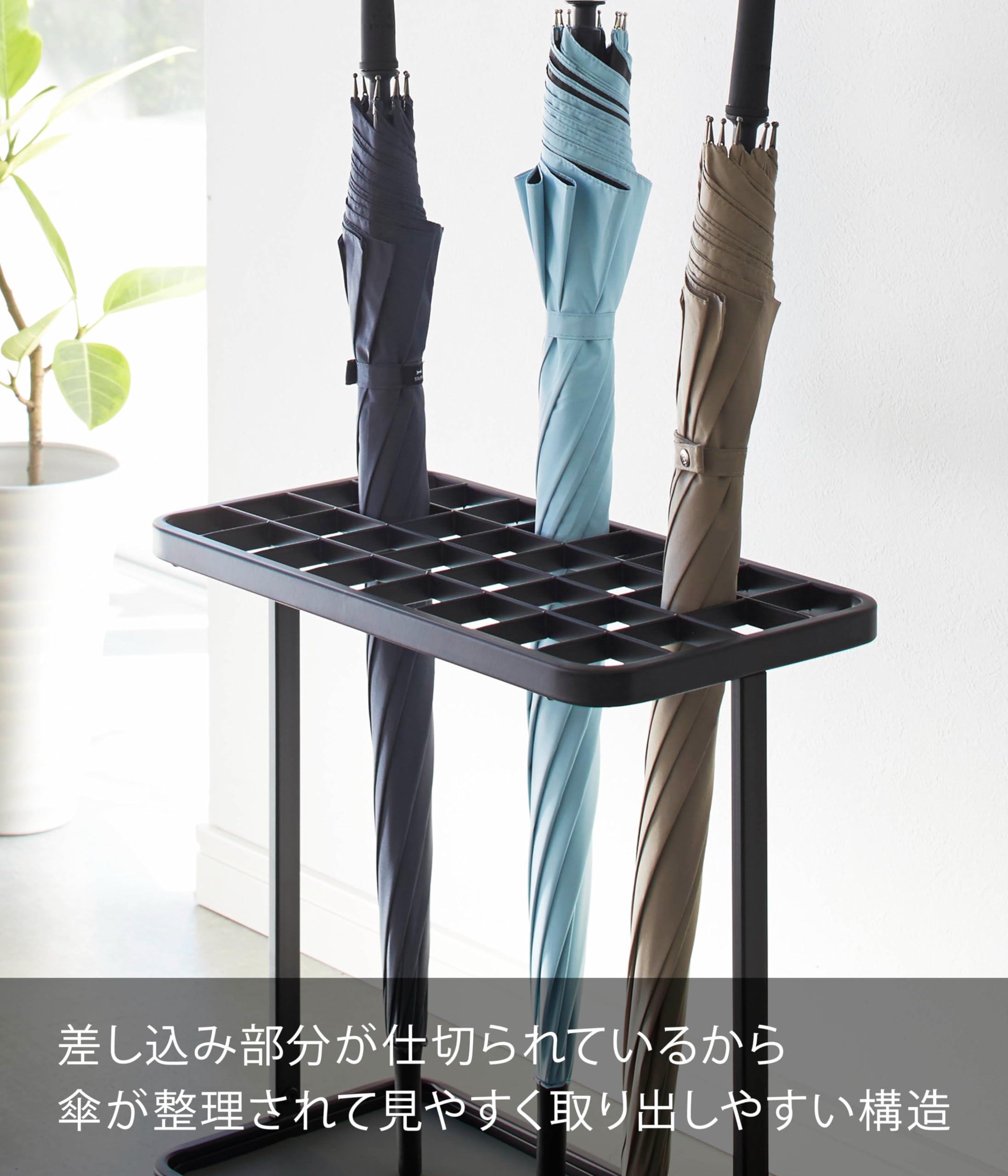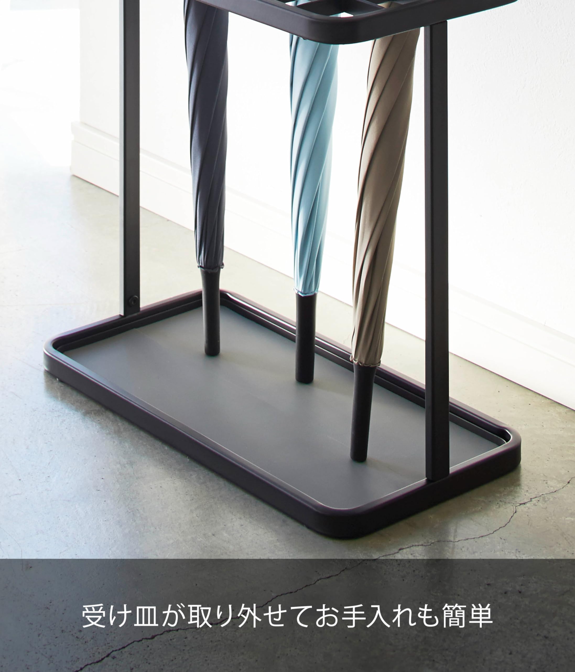 受け皿が取り外せるのでお手入れが簡単。差し込み部分が仕切られているので傘が整理され、見やすく、取り出しやすい構造。