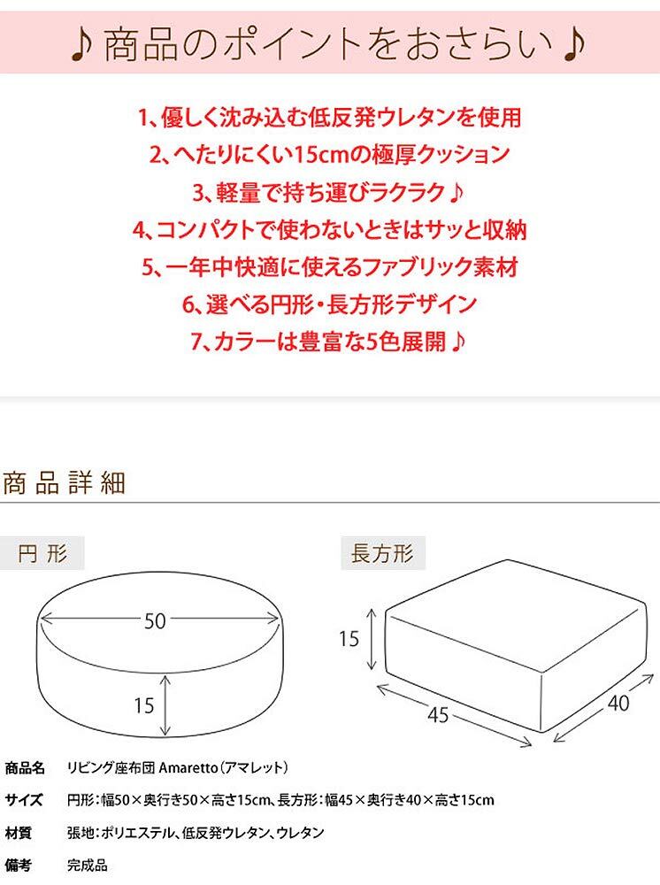 長時間座っているとお尻が痛くなる、クッションが薄くてすぐにへたってしまう、あぐらをかくと腰が疲れる…そんなお悩みの方のためのリビング座布団「Amaretto(アマレット)」。