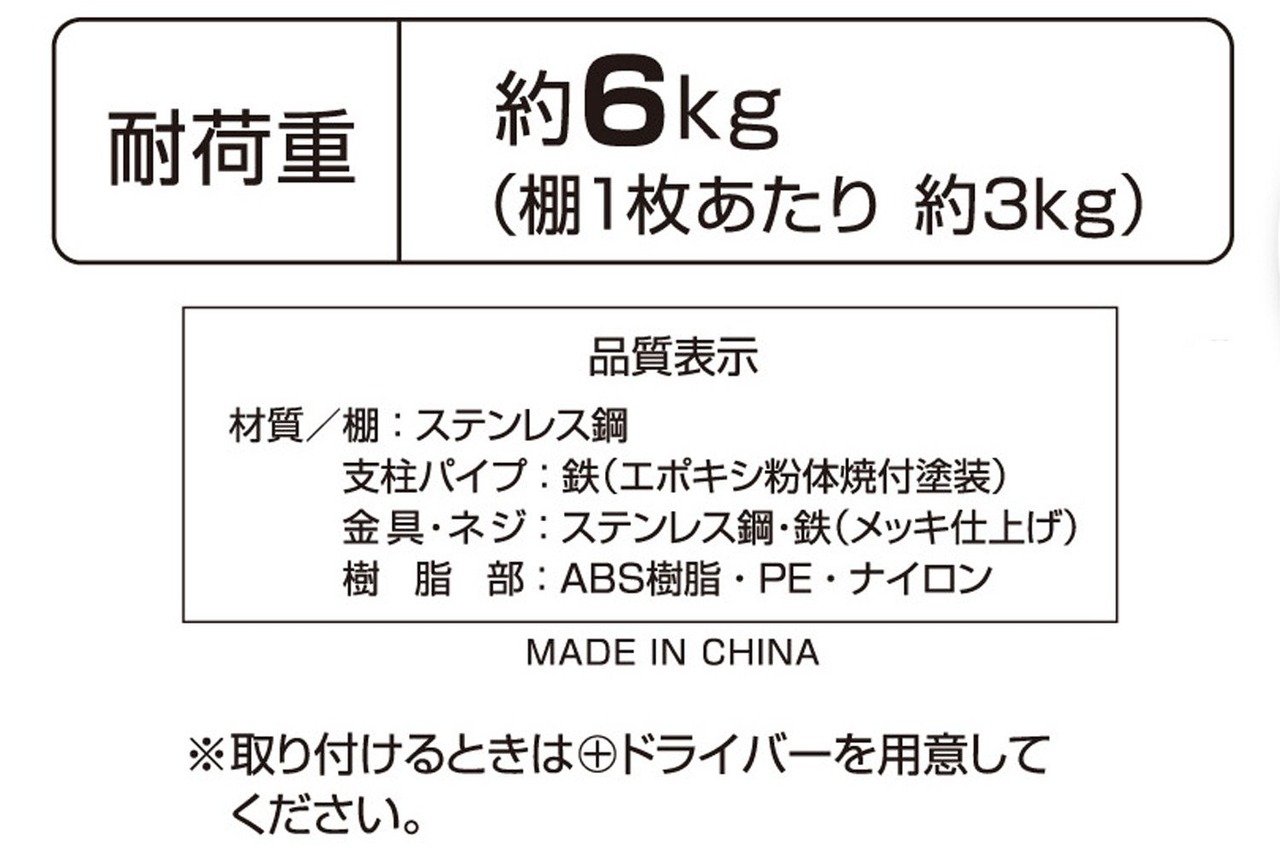 [材質]棚:ステンレス鋼/支柱パイプ:鉄(エポキシ紛体焼付塗装)/金具・ネジ:ステンレス鋼・鉄(メッキ仕上げ)/樹脂部:ABS樹脂・PE・ナイロン