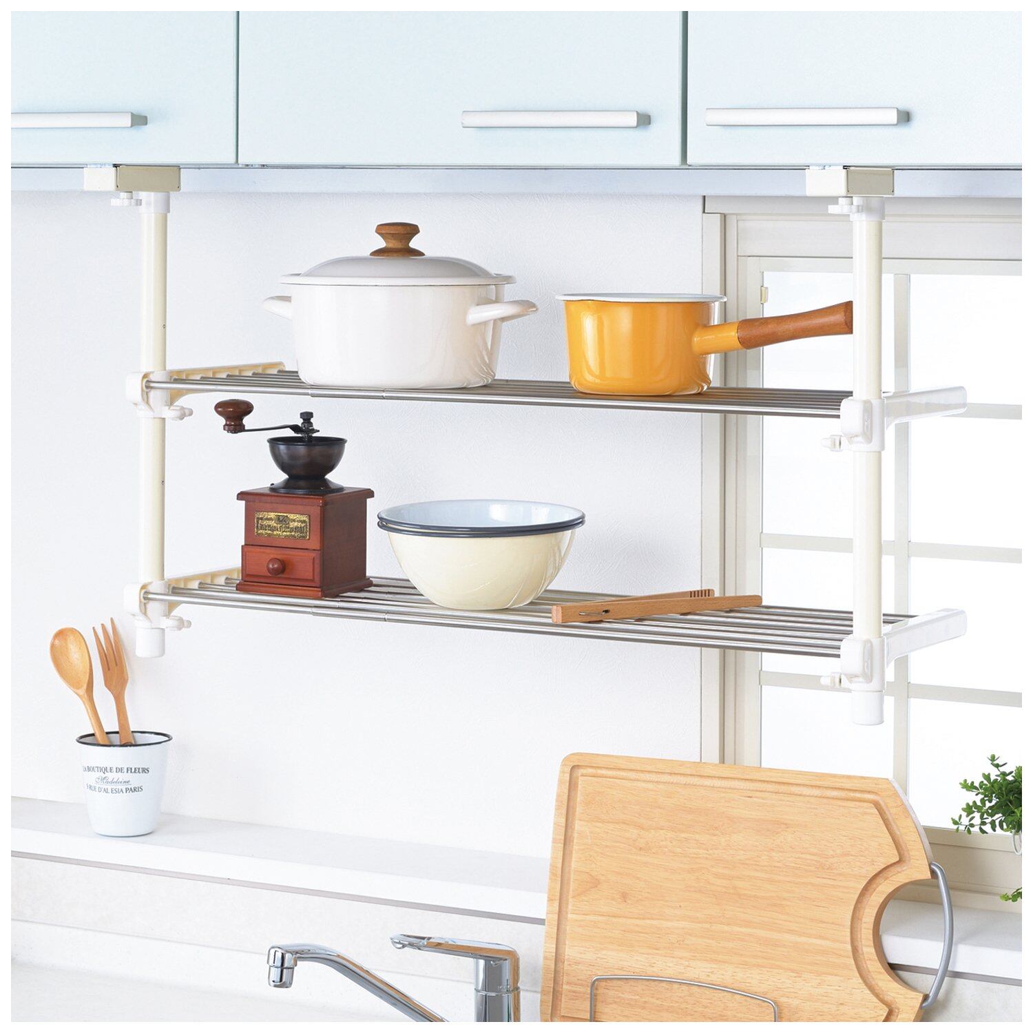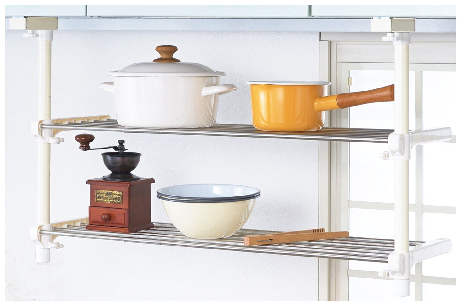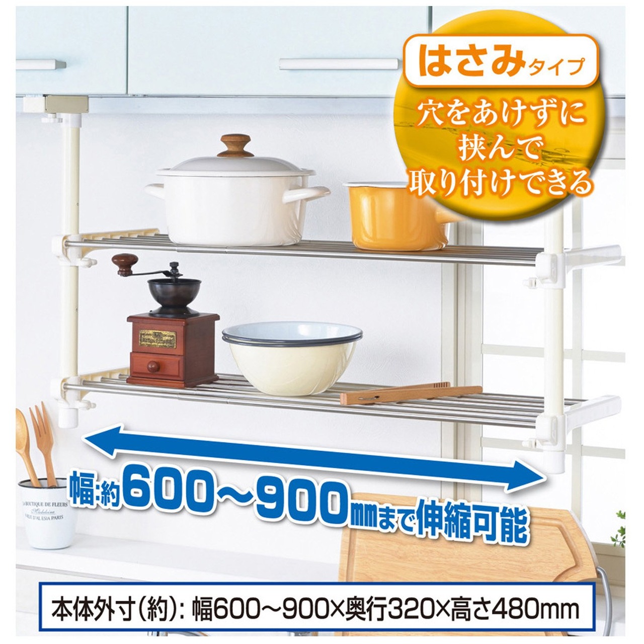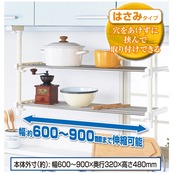 ●棚幅の調整が可能で取り付けも簡単●吊戸棚下のスペースを有効活用●穴をあけずに挟んで取り付けできるはさみタイプ●幅約600~900mmまで調整可能●サビにくいステンレス●ストッパー付でパイプ棚を引き出す際のすっぽ抜けがなく安心