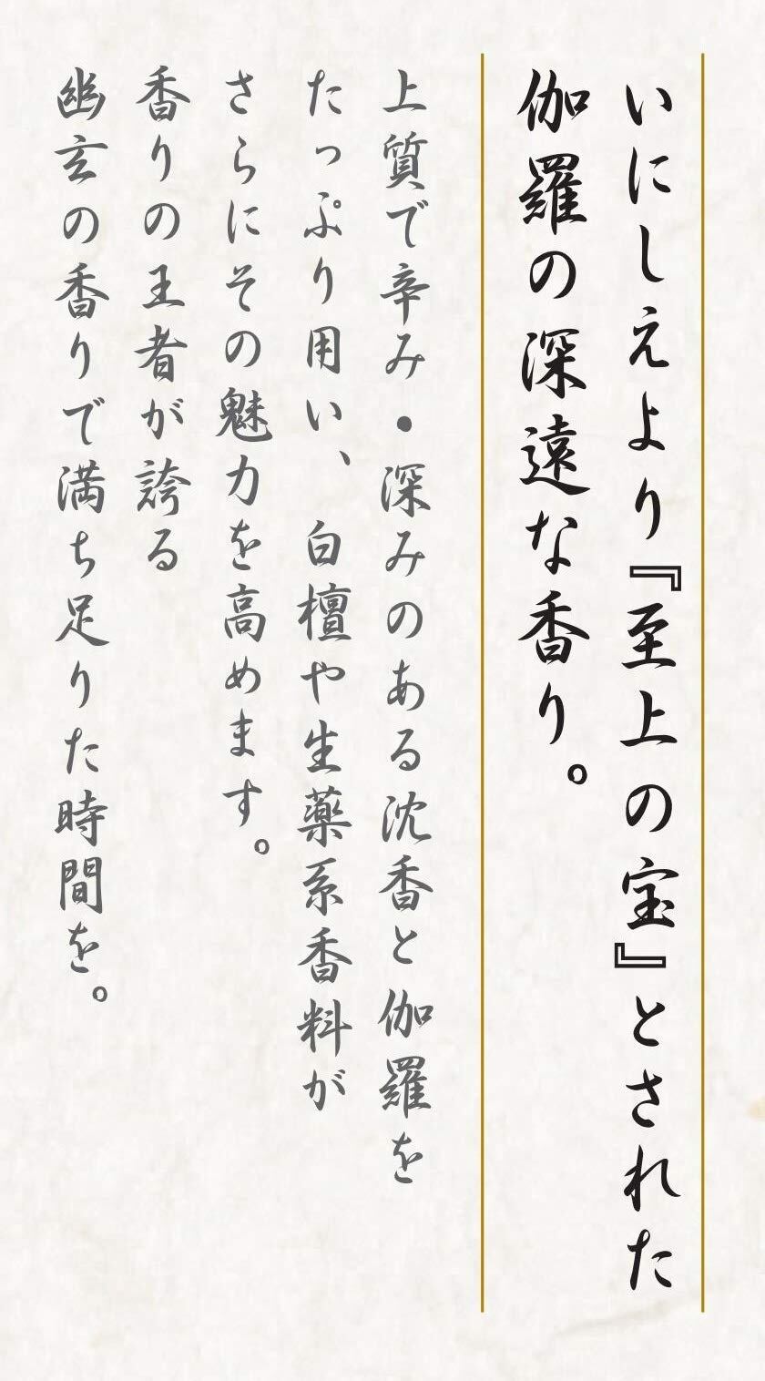 上質で辛み・深みのある沈香・伽羅をたっぷり用い、白檀・香料がさらにその魅力を高めます。香りの王者が誇る幽玄の香り。このえも言われぬ芳香は、悠久の大自然の営みの中で育まれます。穏やかにお部屋に香りが漂います。