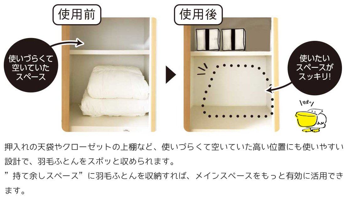 押入れの天袋やクローゼットの上棚など、使いづらくて空いていた高い位置にも使いやすい設計で、羽毛ふとんをキュッと収められます。