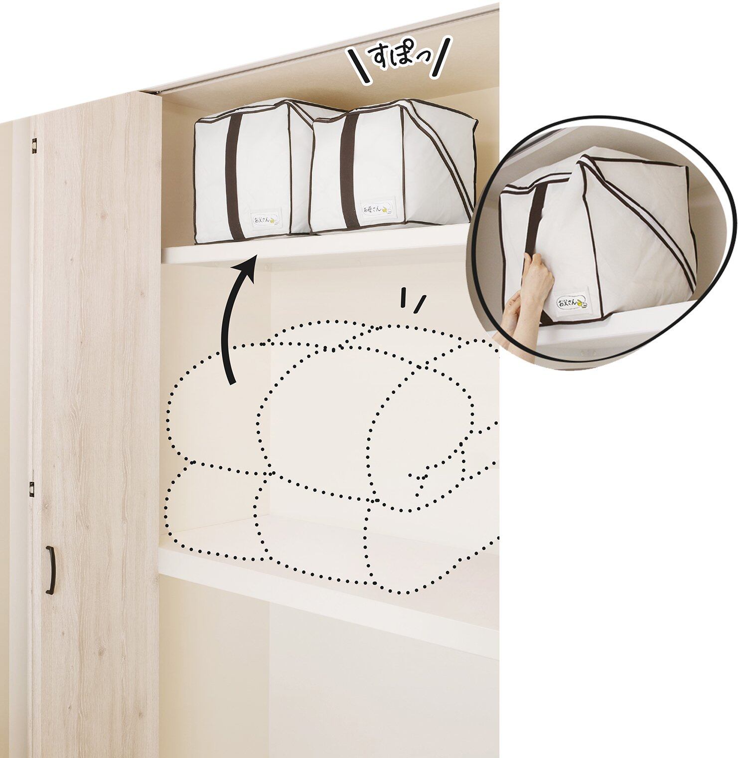 ●かさばる羽毛ふとんがキュッとコンパクトに!持て余している上棚にスポッと収納!。●出し入れ口がナナメに開閉することで、かさばる羽毛ふとんをコンパクトに収納できます。素材には軽量で通気性のよい厚手の不織布を使用しています。。●押入れの天袋やクローゼットの上棚など、使いづらくて空いていた高い位置にも使いやすい設計で、羽毛ふとんをキュッと収められます。4