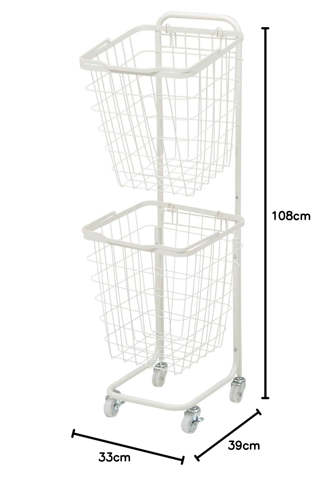 萩原 ランドリーラック バスケット 脱衣 洗濯物 かご 2段 【取り外し・積み重ねOK】 大容量 ランドリーワゴン ワイヤー キャスター付 ホワイト KR-3970WH