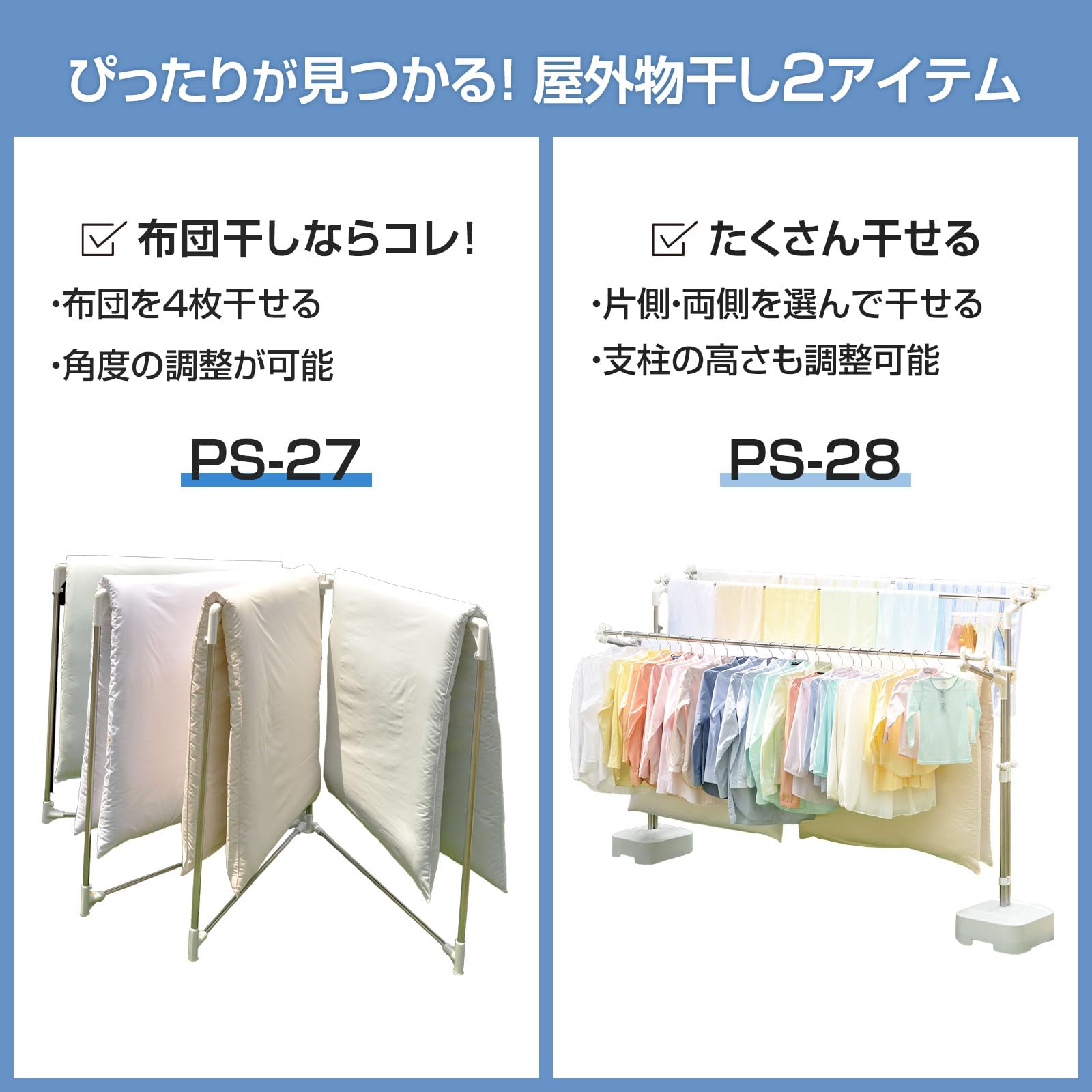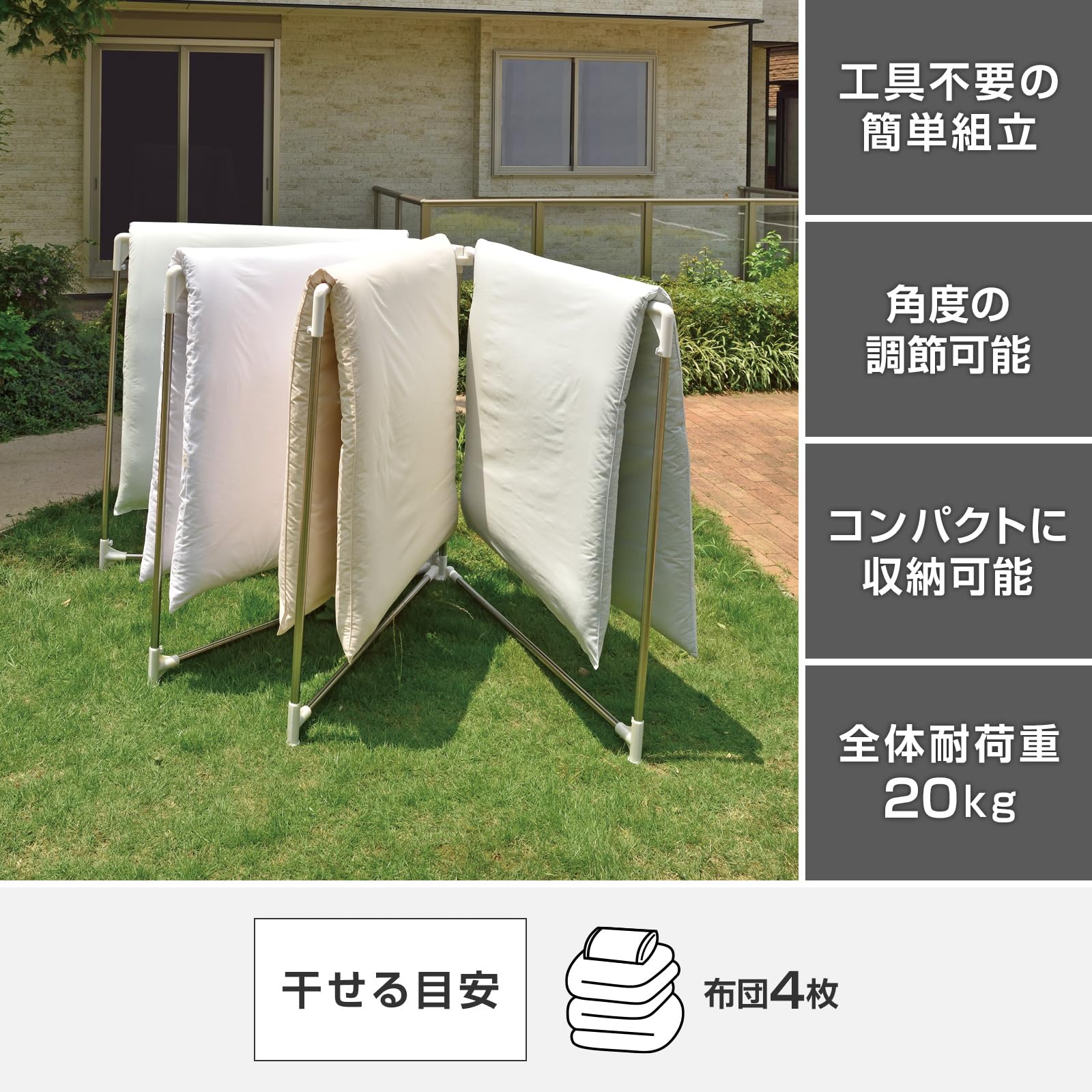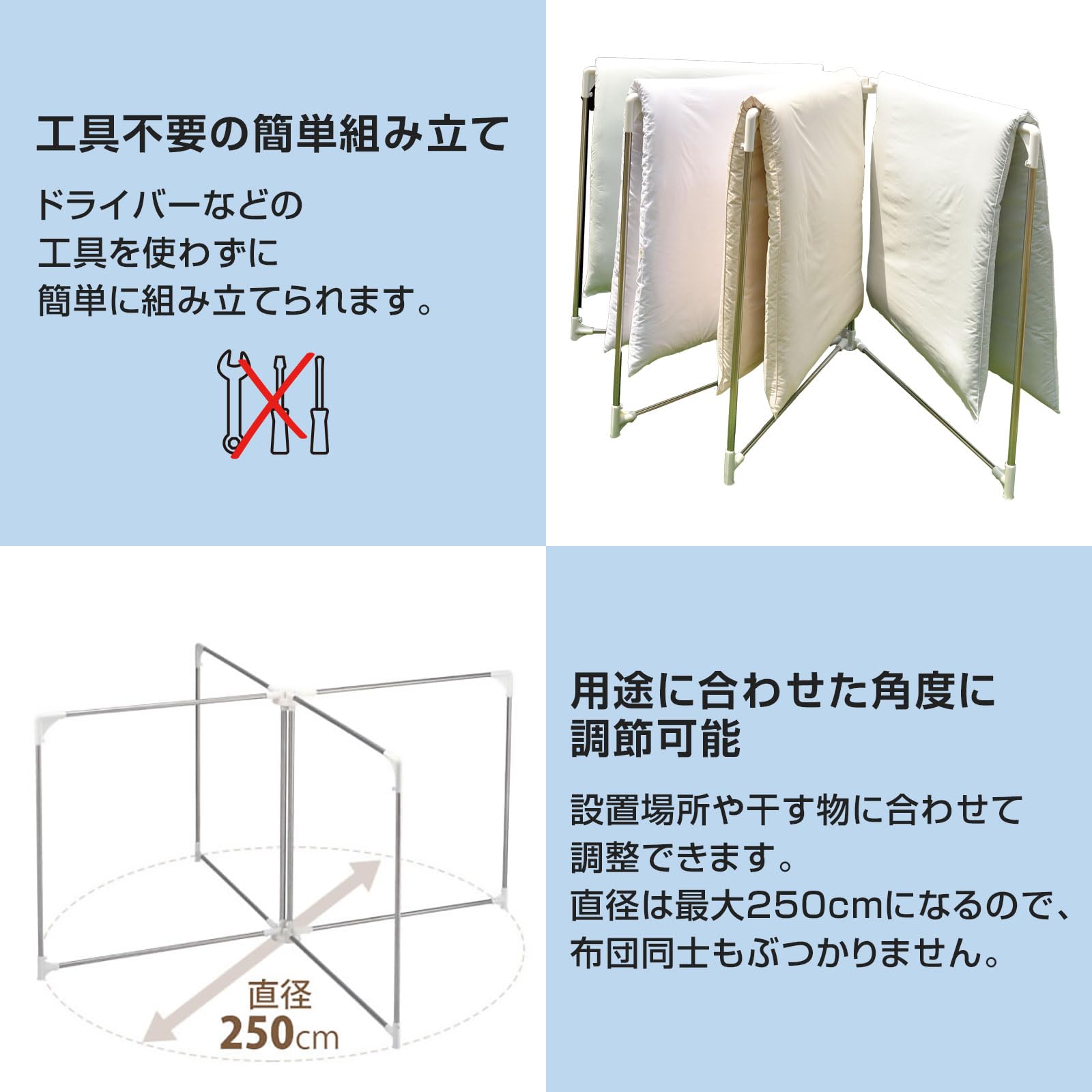 布団を干しても地面に接触しにくい高さ設計となっており、大切な布団をうっかり地面に付けちゃうなんて心配事も減らせます。設置場所や干す物に合わせて干し部の角度を自由に調整可能。直径は最大250cmになるので、布団同士が干渉することも減らせます。変形しやすい角の部分には補強を施し、より頑丈で曲がりにくい設計にいたしました。歪みの心配も少ないので、長くご使用いただけます。スリムに折りたためるので、使用しない時はコンパクトに収納可能。