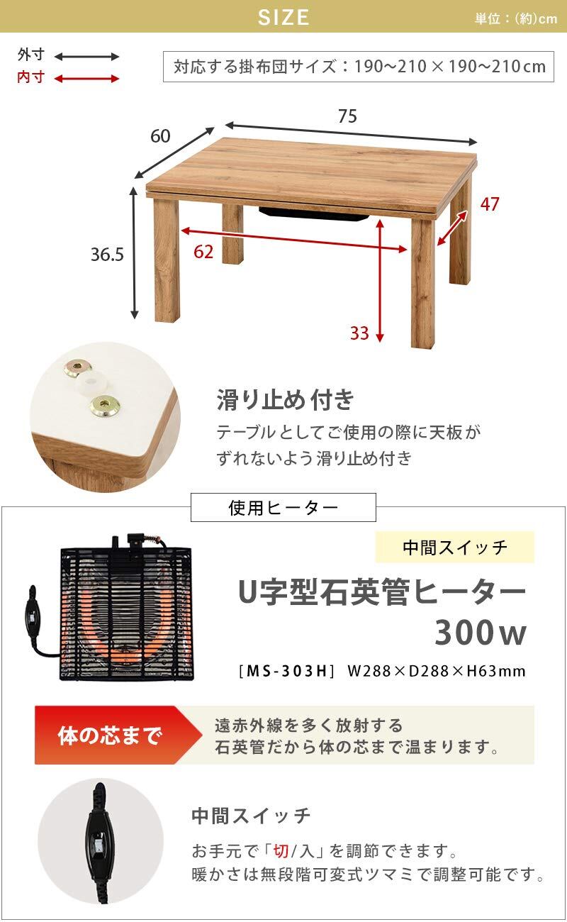【特価商品】萩原 こたつ こたつテーブル センターテーブル カジュアル 一人用 コンパクト 【リアルな木目調天板】 長方形 ウッド調 ヴィンテージ 奥行60×幅75×高さ37 ナチュラル カルテス7560 | ももくま屋さん