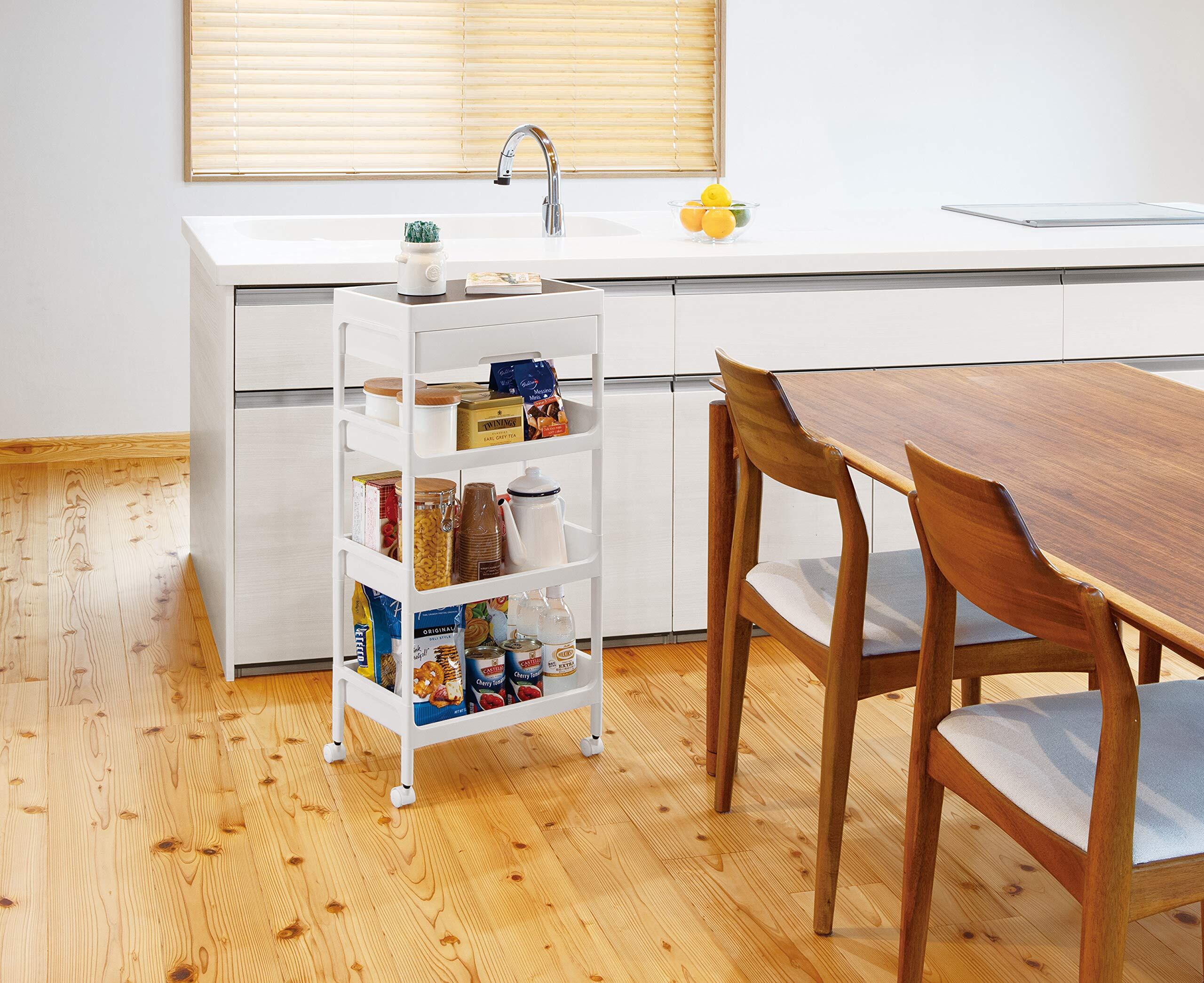 リバーシブル天板が特徴の引き出し付きのシンプルなワゴン。