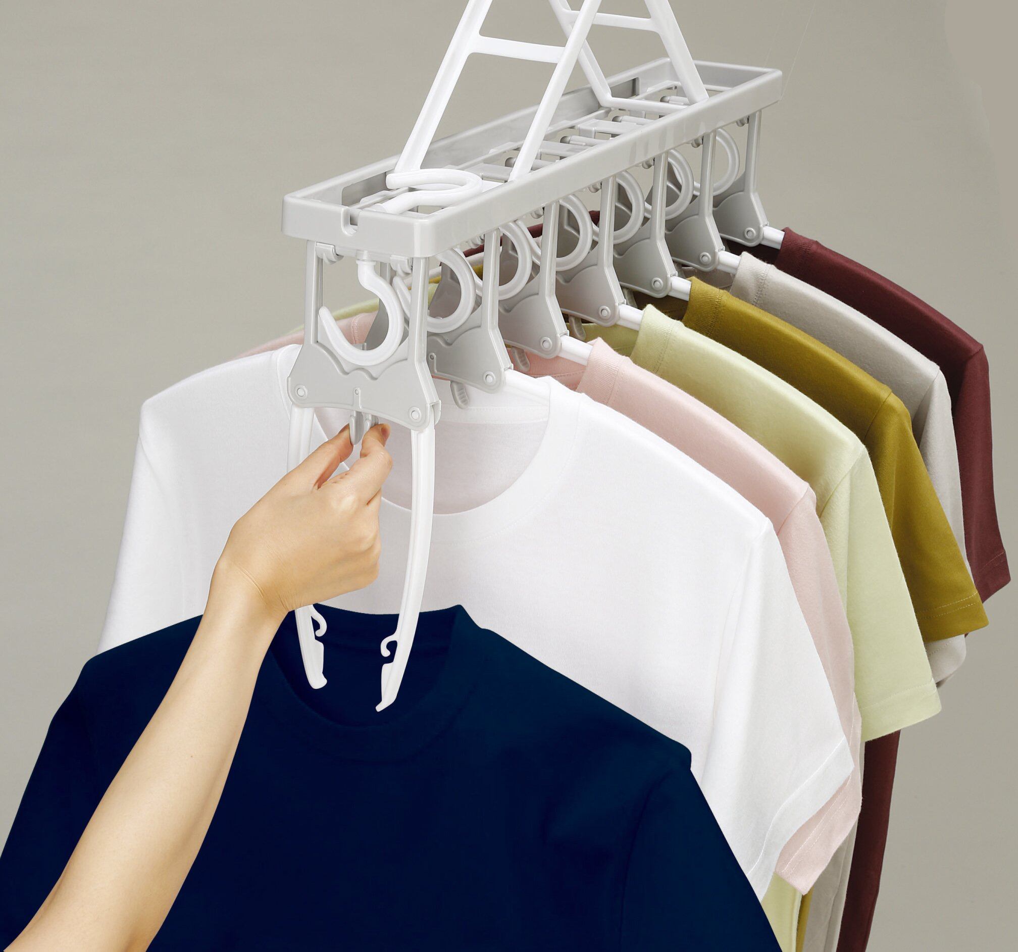 ハンガー下の突起をつまめばアームが閉じ、ワンタッチで取り入れられます。